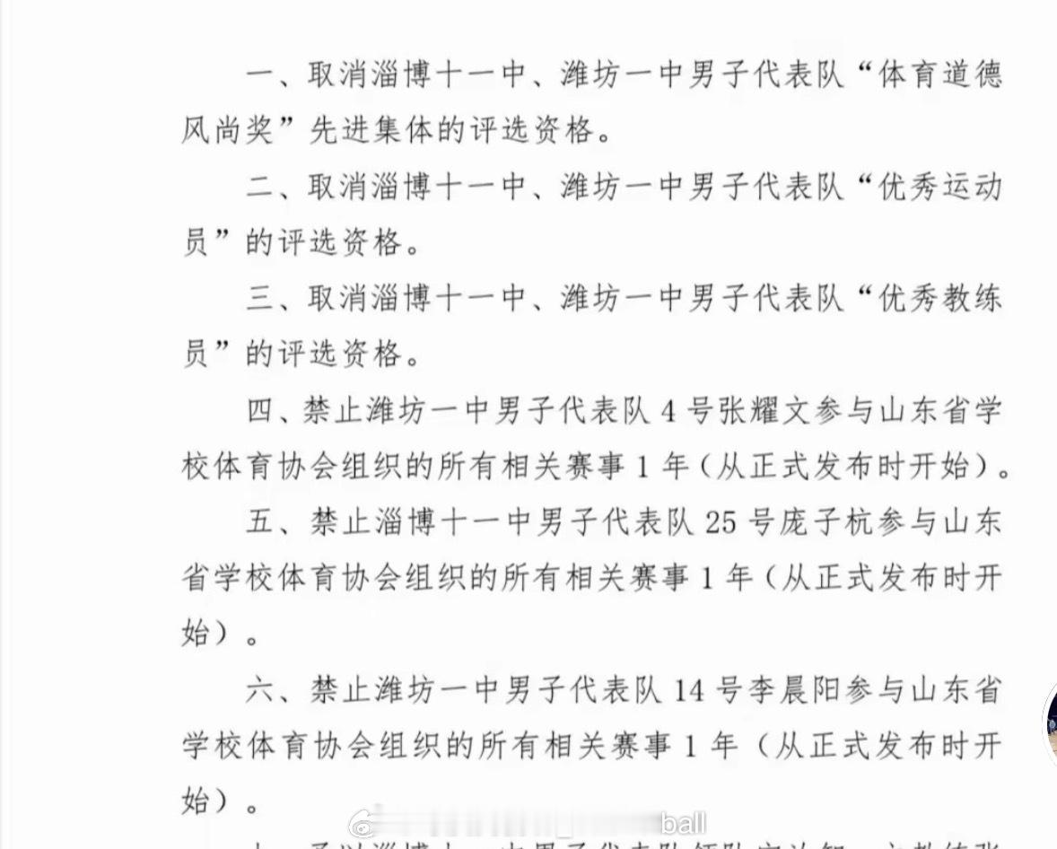 山东省学校体育协会对耐克高中联赛冲突事件开出重磅罚单:三名球员被禁止参加山东省比赛一年,取消两所学校参与评选的资格山东淄博一中学生篮球赛后爆发冲突