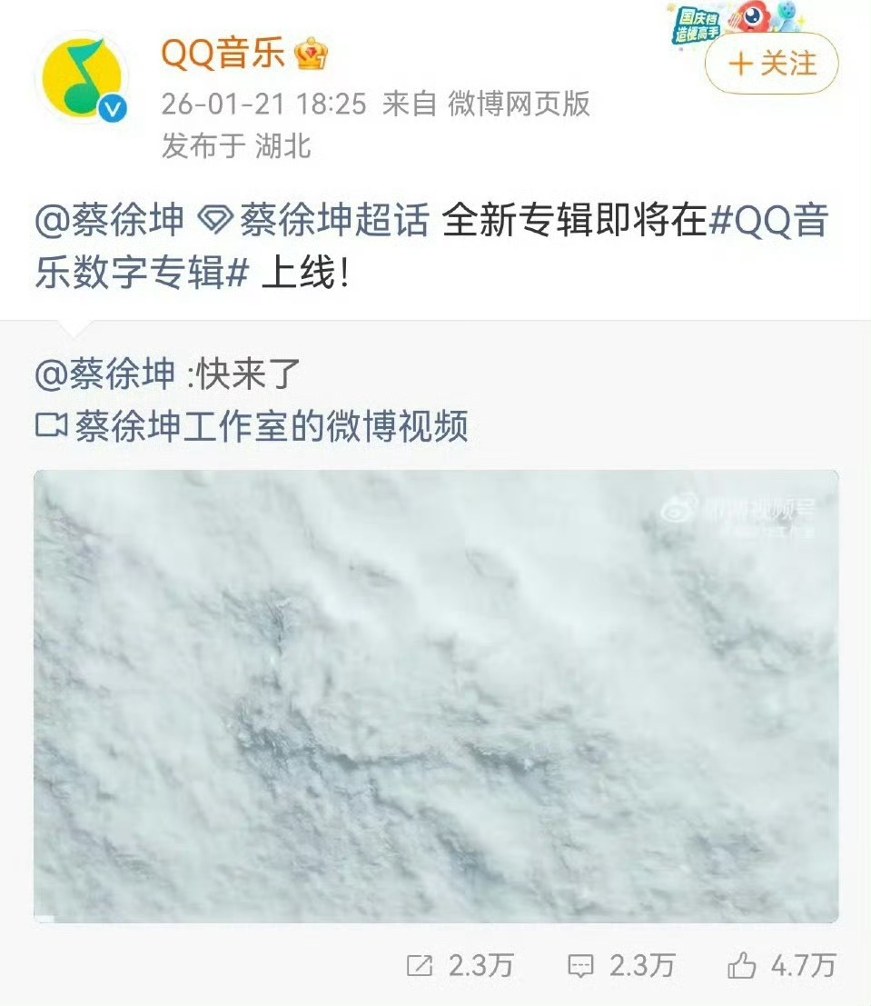 蔡徐坤 快来了蔡徐坤时隔两年将发新专辑,预约通道定于1月23日上线。近期,他通过印尼节目表演、上海活动等多次为新作预热,提及专辑MV拍摄历时三天三夜。