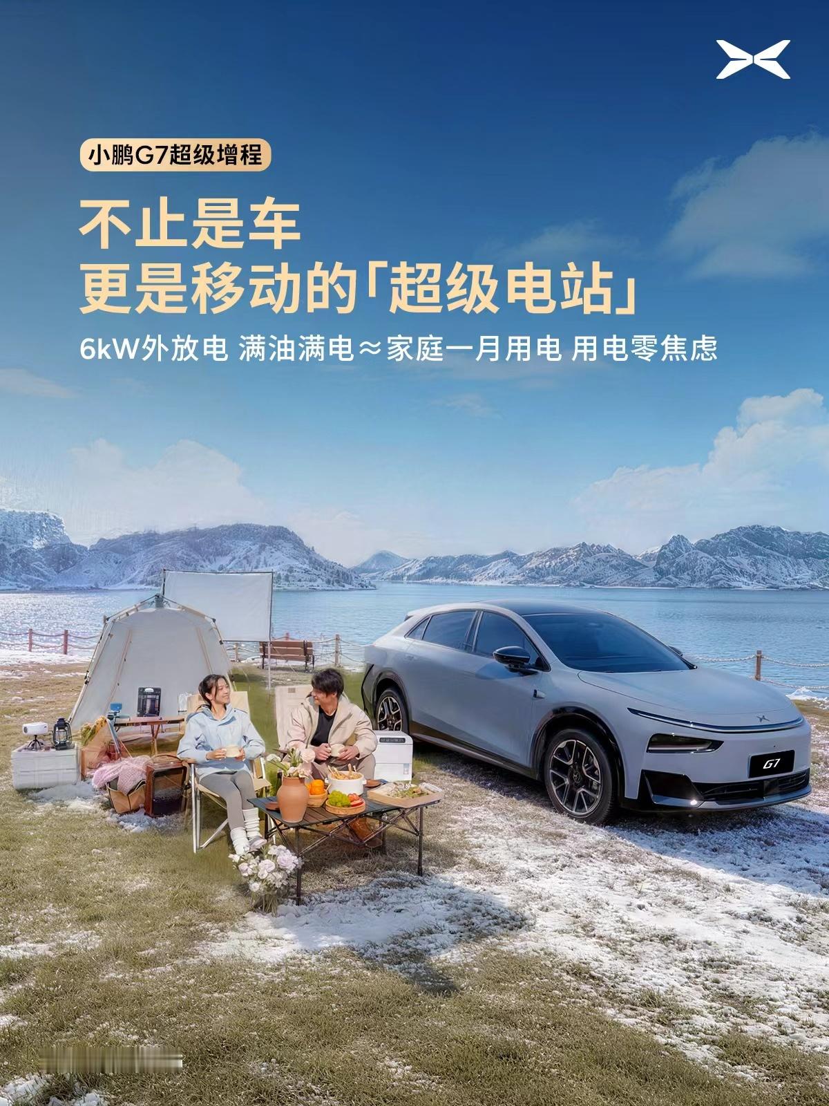 小鹏G7超级增程无焦虑自驾游小鹏G7超级增程不仅是车,更是移动的超级电站,小鹏G7超级增程除了拥有1704km的全球最长续航外,还拥有同级领先的6kW对外放电功率,满油满电能支持让一家人无论在哪都能实现户外用电自由:无论是冰箱、电暖炉、电煮锅、投影仪、音响等都能多设备同时使用;拥有小鹏G7等于拥有一个家,实现无焦虑自驾游!小鹏G7超级增程 ,6kW外放电,满油满电支持家庭一月日常用电,实现用电零焦虑!