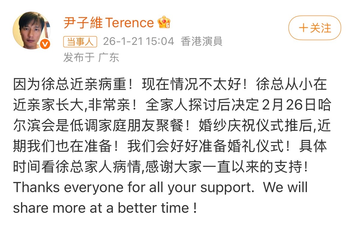 徐冬冬尹子维婚礼将延期徐冬冬因家人病重婚礼延期 1月21日,尹子维发文透露:“徐总近亲病重,情况不太好”,原定2月26日哈尔滨婚纱庆祝仪式暂缓。经家人探讨,当日将调整为家庭朋友聚餐,“婚纱庆祝仪式推后,近期我们也在准备”,具体举办时间将根据徐冬冬家人病情另行确定。