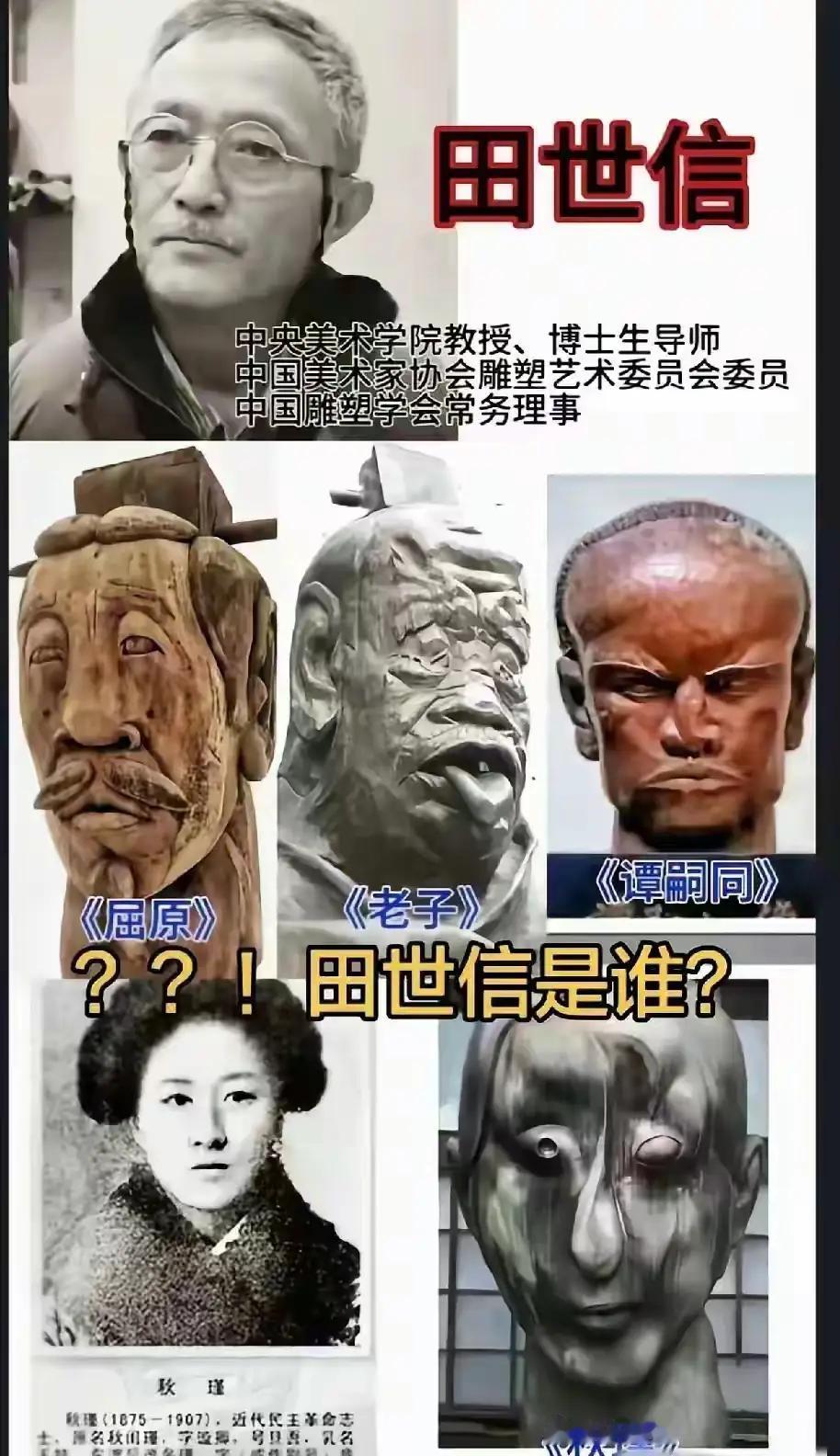 看看这些雕塑,对于丑化工农兵、丑化历史人物、丑化英雄形象的文化行为,必须严厉禁止 《城市农民》雕塑, 是中央美术学院的雕塑作品,创作于2000年,以农民工为原型,用木讷空洞的眼神和蜷缩蹲坐的姿态,刻画了当时城市外来农民工的神态动作。言为心声,作品能够反映出创作者的心态。雕塑根本就没有把改革开放的参与者,城市建设者,甚至是改变自己家庭命运的农民工的形象彰显出来,就是根据自己对社会阶层的浅薄了解,形成了诋毁农民工形象的雕塑作品。 不仅如此。甚至是集中发现了很多这样的类似的雕塑作品。比如那三个工农兵形象,矮胖矮胖,完全是丑化了我们的社会绝对正面主力工农兵。历史上我们有很多的工农兵形象,无论是雕塑还是浮雕,这是画报,还是年画,都有工农兵高大形象,伟岸健康,坚定向前。说明作者是别有用心的,就想诋毁我们社会的中流砥柱,这根本就不是什么艺术作品,是毒草。你想一想工作病的形象,如果在社会当中是这样的形象,是不是社会上就会产生一种不尊重工农兵的感觉? 我们不是遇到事情就是上纲上线的,我们对任何的艺术,对任何的文化都是存在一种包容的态度。但是看看清华美院的那些艺术家创作出来的作品,是不是就有一股歪风邪气在里面,是不是想表达出与主流不一样的心态,是不是想把我们的思维引到沟渠里去。 你再看一看中央美院田世信这些雕塑作品,谭嗣同、秋瑾是这样的被丑化了,那还像个人的样子吗?是鬼吗?他们可是中国人民在探索民族振兴,实现中华民族走向光明道路上最重要的标杆式人物,竟然被如此丑化了,而且竟然堂而皇之称为雕塑艺术。 实际上,艺术不是没有界限的,有关正义人士,有关眼睛明亮领导,有关文化主管部门,应该站出来抵制这种无止境的文化边际侵蚀效应,英雄就这样一步一步的被丑化了,你能想一想他们下一步想干什么吗? 还有呢,不仅如此田某信他对历史人物也下手了,看看他那屈原、老子的形象,被丑化到恶心的程度。艺术对于一个历史人物,抓住一个大环境中瞬间,是很好的表达方式,也是雕塑艺术最擅长的表达,历史人物可以是清瘦,可以是凝视,可以是深思,甚至是可以临风 但绝不能死人一样,耷拉眼睛,伸出舌头,那个屈原和老子的雕像表达什么?感觉就想摧毁中国人心目当中的文化偶像。如学生长期看到这样的类似雕塑,你还愿意去了解老子和屈原吗? 对于丑化的雕塑,再一次讲,我们不是上纲上线,无论是从工农兵还是到城市建设者,无论是英雄人物还是历史人物,都是中国现实脊梁,也是历史中的佼佼者。需要以正确的艺术态度和手法来表达他们,来宣传他们的正面形象,不能让一些心术不正的人用所谓艺术来侵蚀我们的社会的每一个角落,来败坏我们的社会风气,打击我们的文化,摧毁我们心中的工农兵以及英雄的高大形象。 同志们,丑化雕塑不是孤立的,是一股逆流思潮,警惕这种文化领域的歪风邪气,警惕这种以艺术的手法诋毁中国人民心中灯塔的行为。对于丑作,不答应,不认可,不允许!