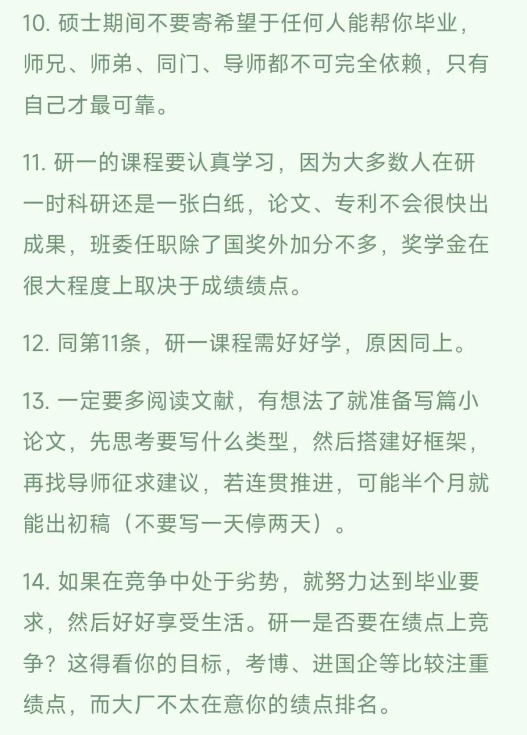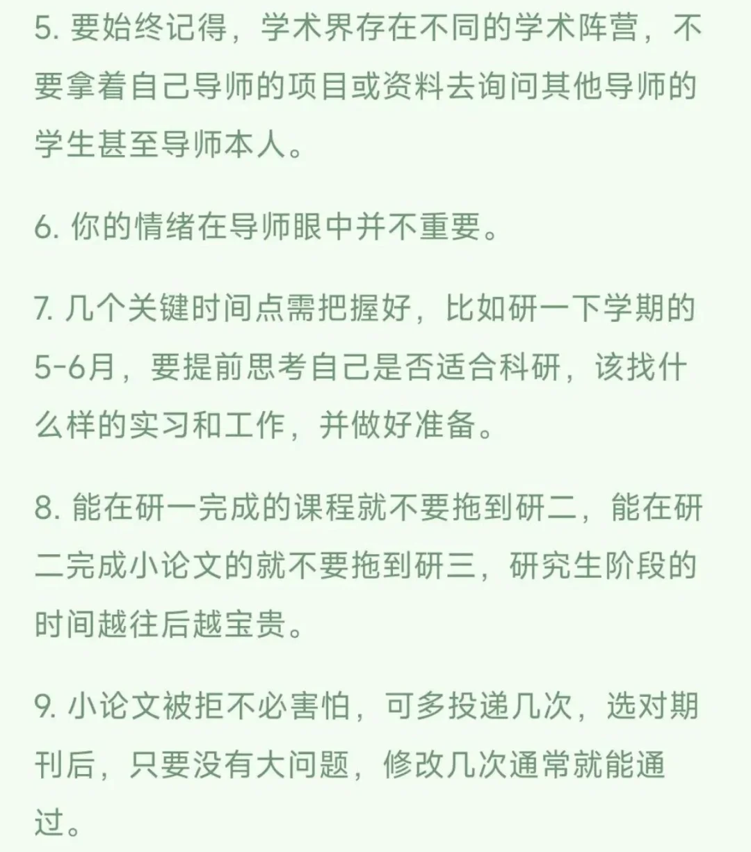 家境一般的研究生,希望你研一就知道这些 2025年10月29日 上午10:36| 627字 1. 研究生并非传统意义上的学生,导师也不是单纯的老师,同门亦不是普通同学。 2. 切勿与导师关系闹僵,在导师面前你基本没有有分量的筹码,而导师掌握着你研究生生涯的走向,若关系破裂,要么离开要么忍耐,切勿走极端。 3.不要得罪学院里财务、教务部门的工作人员,否则会给你带来诸多麻烦。 4. 平时若有机会且不排斥,可多与就业指导老师建立良好关系,这会很有帮助。 5.要始终记得,学术界存在不同的学术阵营,不要拿着自己导师的项目或资料去询问其他导师的学生甚至导师本人。 6.你的情绪在导师眼中并不重要。 7.几个关键时间点需把握好,比如研一下学期的 5-6月,要提前思考自己是否适合科研,该找什么样的实习和工作,并做好准备。 8. 能在研一完成的课程就不要拖到研二,能在研二完成小论文的就不要拖到研三,研究生阶段的时间越往后越宝贵。 9.小论文被拒不必害怕,可多投递几次,选对期刊后,只要没有大问题,修改几次通常就能通过