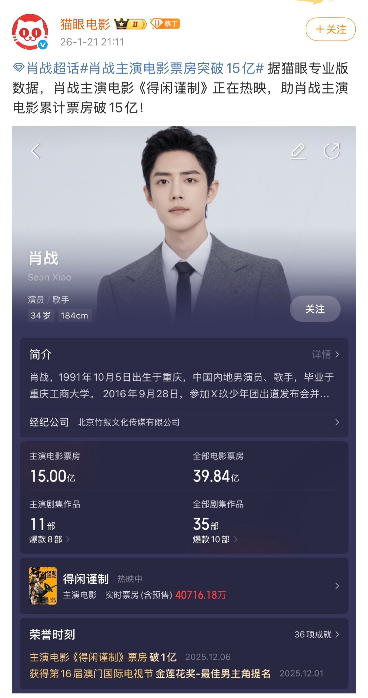 得闲谨制第14次票房逆跌了👏肖战一番电影总票房突破15亿
