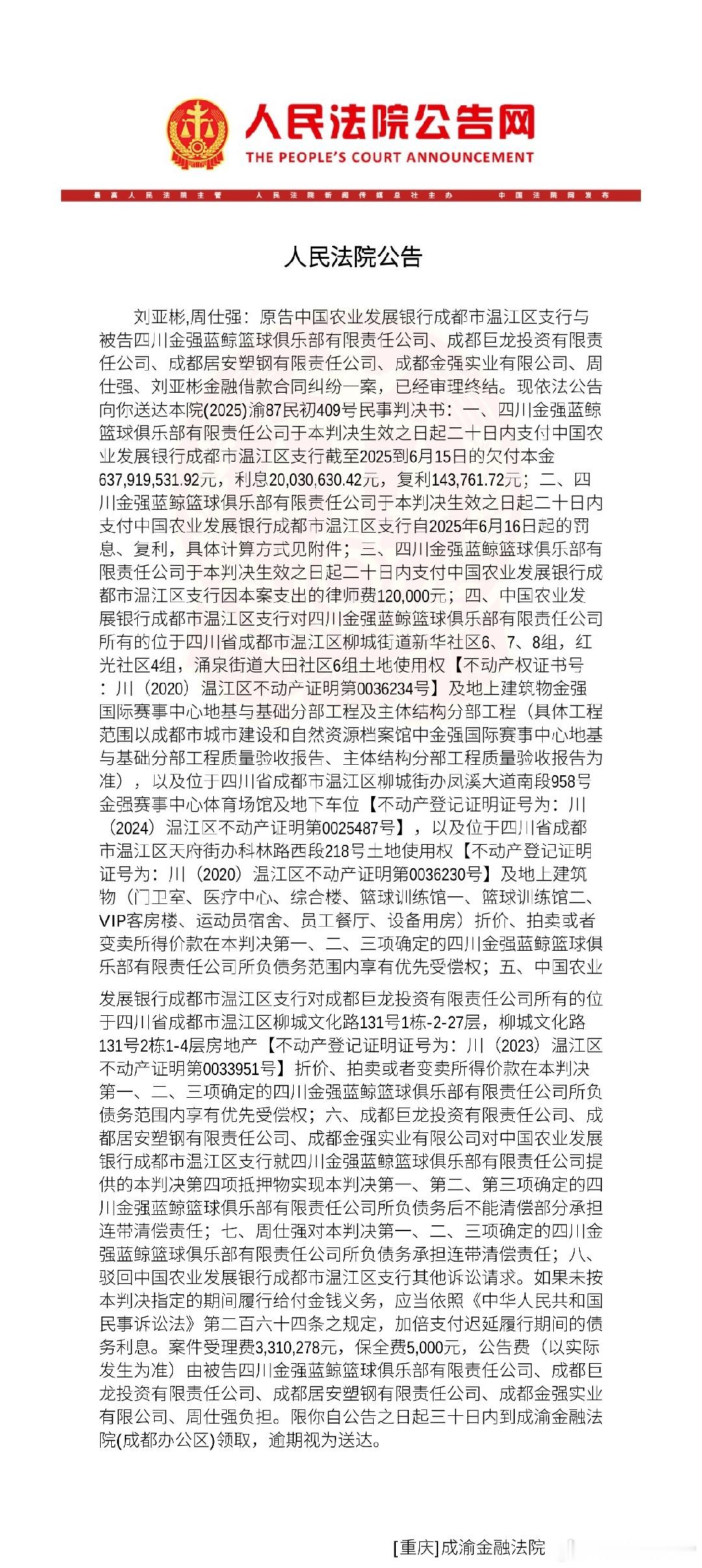 今天,四川金强蓝鲸篮球俱乐部被法院裁决,未来20天内需向中国农业发展银行成都市温江区支行支付6.58亿元的借款+利息,若逾期不还,银行有权对温江金强国际演艺中心以及周边土地、四川金强篮球训练基地(金强体育宾馆)以及其它地产项目进行拍卖。