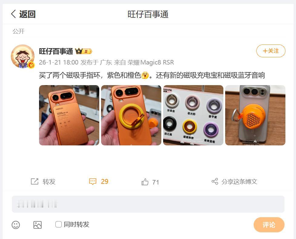 刚刚看到数码圈内大佬,分享了荣耀Magic8 Pro Air的磁吸配件,较为实用的就是磁吸充电宝,日常使用的话还是刚需,搭配手机毫无违和感,当然也有多彩的磁吸手指环可选,六款颜色确实蛮好,没想到还有磁吸蓝牙音响,这个我是万万没想到 畅聊数码新品 数码资讯