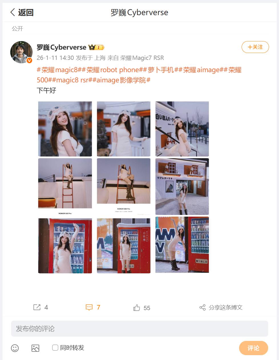 荣耀夜神影像的城市建筑样张满清晰,那么夜景或者光线较暗的环境下,人像写真的能力到底如何呢?荣耀首席影像工程师罗巍分享了一组日系人像写真,拍摄的环境场景光线也是蛮复杂的,不过最终的成效效果,氛围感十足,飘落的雪花也蛮自然,整体很传神 畅聊数码新品 数码资讯