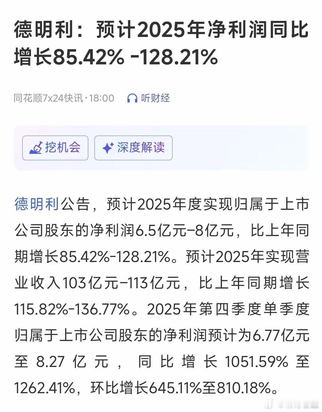 德明利四季度业绩暴增,存储芯片涨价逻辑带来的业绩驱动已经显现!德明利公司公告称,2025年实现净利润6.5亿元~8亿元,同比预增85%~128;其中第四季度净利润达到6.77亿元~8.27亿元,同比预增1051%~1262%。单看全年业绩是很一般的,但是从第四季度看业绩非常亮眼,单季度盈利能力明显提升,主要还是受涨价影响带来的业绩驱动!