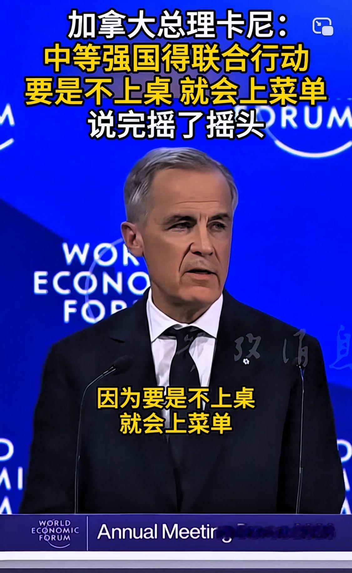 卡尼来了趟中国后,是越来越清醒了,在达沃斯年会上直言:“中等强国得联合起来,要是上不了桌,就会上菜单” 1月20日的达沃斯世界经济论坛年会上,卡尼在演讲上尖锐指出,二战后建立的“基于规则的国际秩序正在消亡”,世界进入了大国零和博弈的时代。 他认为,一些大国正在将贸易、金融和供应链“武器化”,作为胁迫他国的工具。在这种环境下,中等强国如果各自为战、心存幻想,就只能在被大国主导的谈判中沦为“牺牲品”。 因此,他呼吁全球中等强国必须放弃顺从幻想,团结起来采取联合行动,通过建立多元化的联盟来增强自身议价能力和战略自主,避免成为大国菜单上的“盘中餐”。 总之,加拿大是在卡尼带领下进行务实转向,避免过度依赖单一国家。只是,这种“清醒”更多来自“自保”。尽管,在华期间,卡尼强调“中国比美国更靠谱、更可预测”。但,这并非简单的“亲中”。毕竟,中国也是它们眼中的大国……