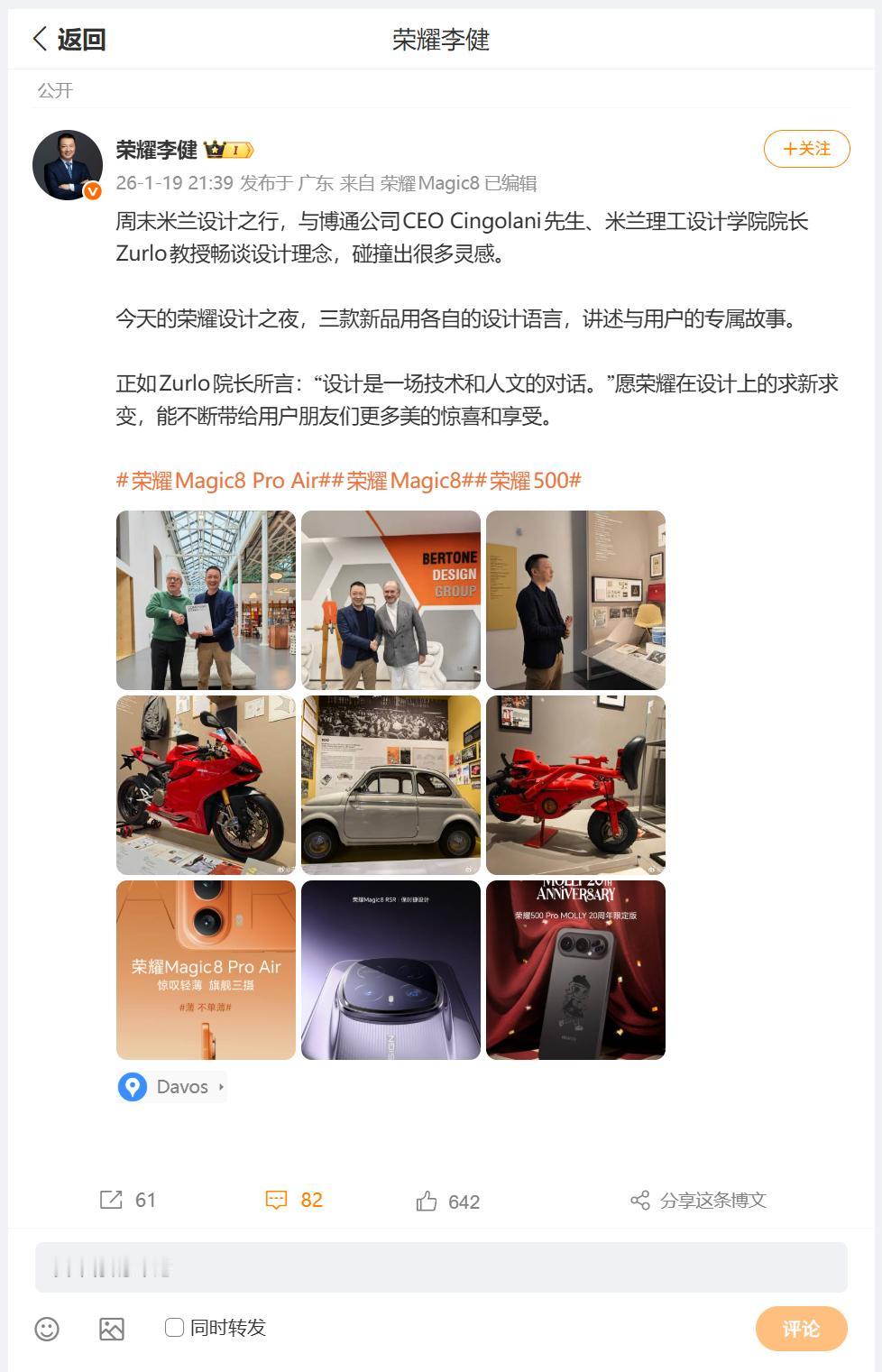 荣耀CEO李健分享了周末米兰设计之行的感悟,对于李总提到Zurlo院长说的话:设计是一场技术和人文的对话。我觉得非常赞同,通过荣耀近期发布的新品,就能够发现,科技的进步和设计的创新是相辅相成,有所依托的,这波我蛮喜欢荣耀Magic8 RSR保时捷设计 畅聊数码新品 数码资讯