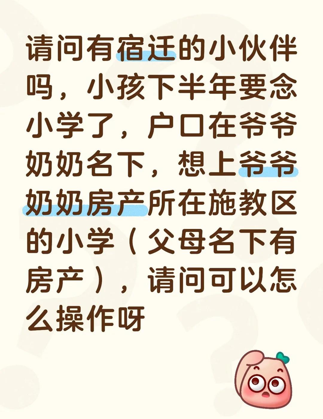 请问有宿迁的小伙伴吗,小孩下半年要念小学了,户口在爷爷奶奶名下,想上爷爷奶奶房产所在施教区的小学(父母名下有别的施教区的房产),请问可以怎么操作呀