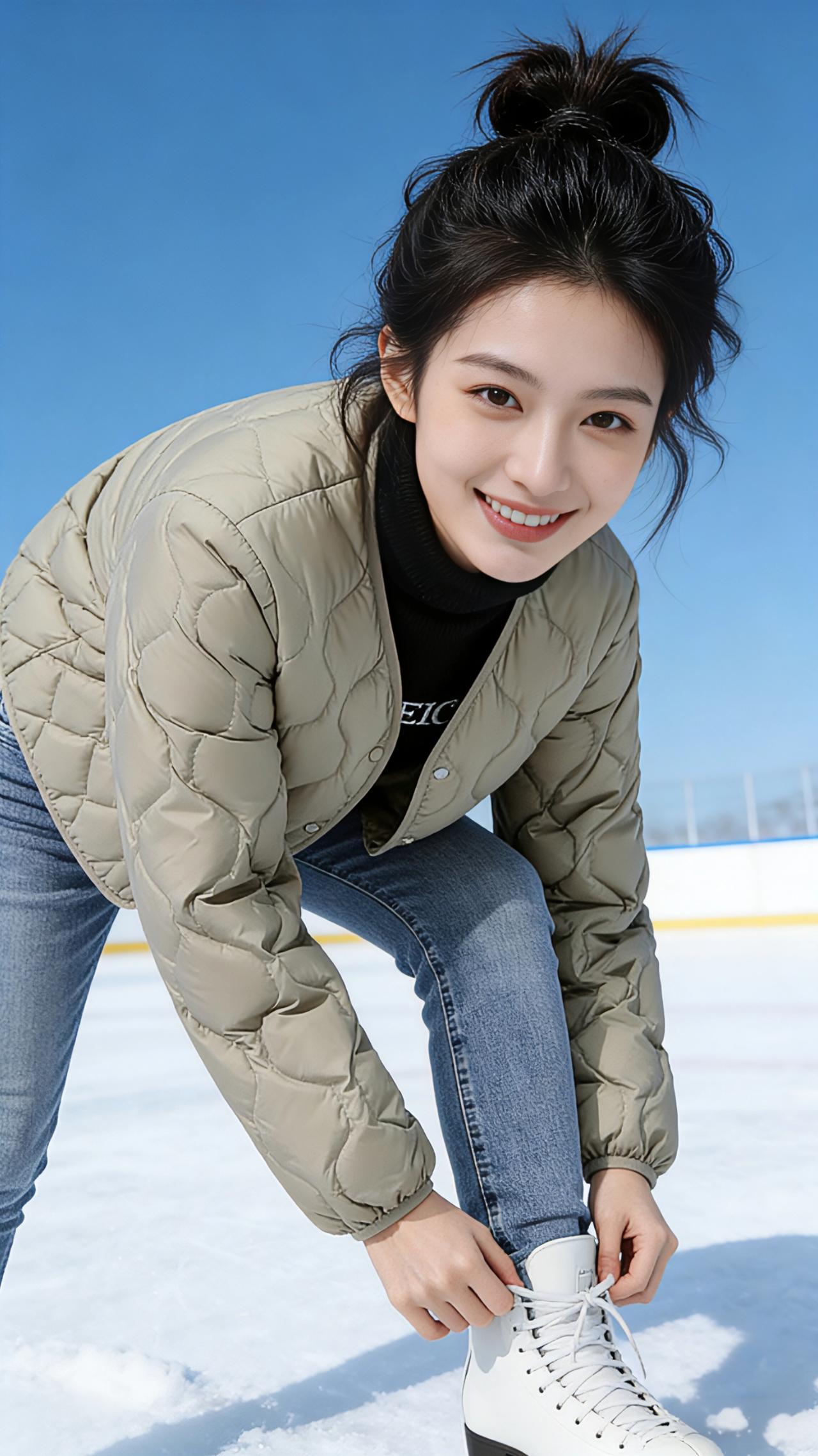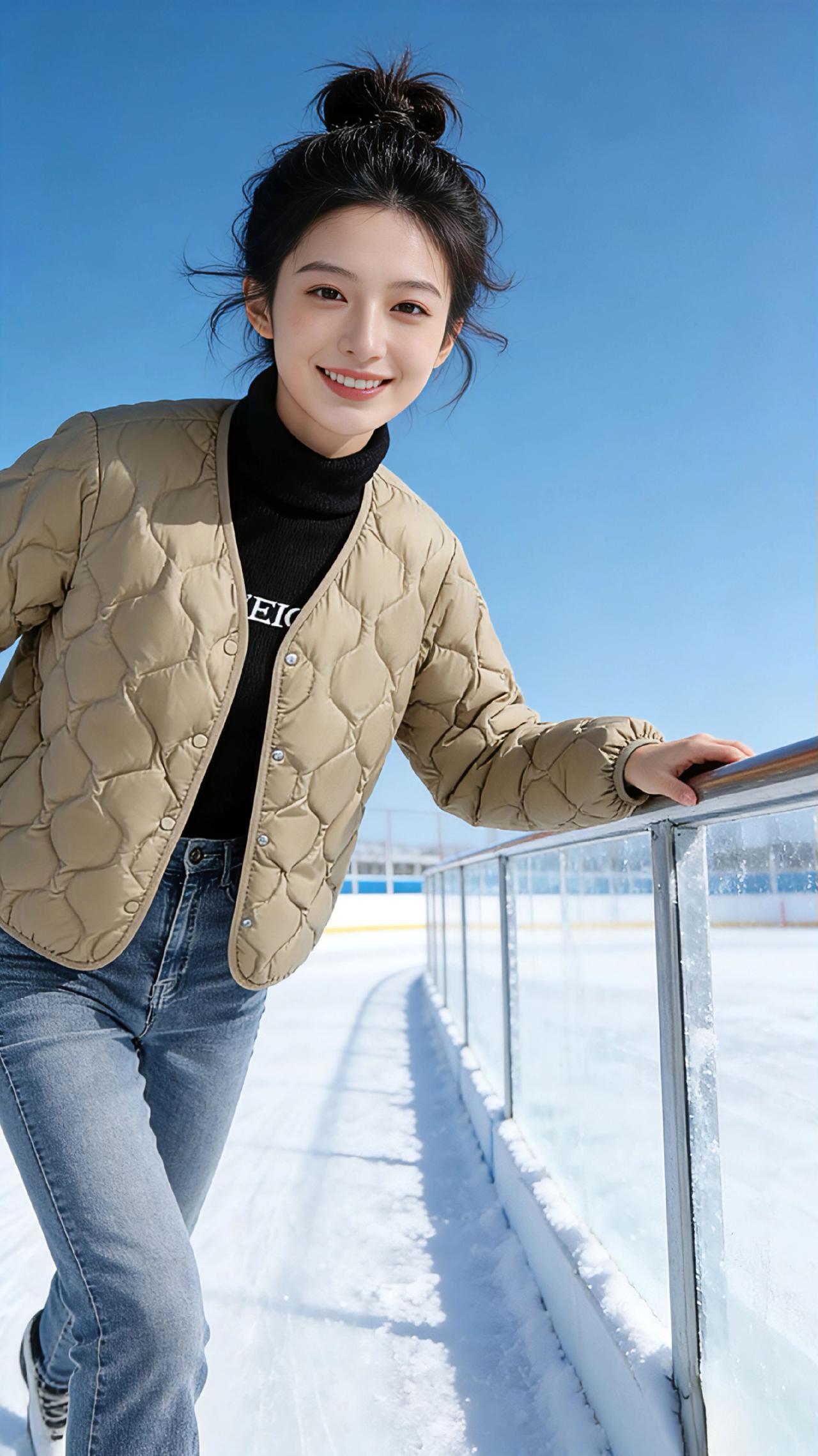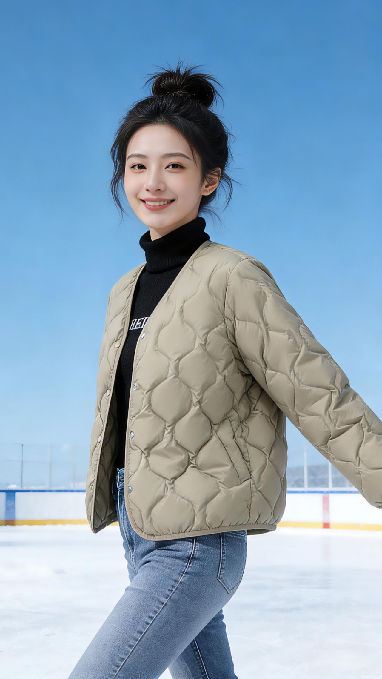 冰场与暖衣 晴朗得没有一丝云的冬日,冰场成了蓝色画布上最亮的一笔。她把头发挽成蓬松的丸子头,像顶着一团柔软的云,而身上那件浅卡其色的菱格纹薄羽绒服,恰好成了连接蓝天与冰面的温柔过渡。 蹲身系冰鞋鞋带时,衣料的菱格纹路在光线下泛起细腻的光泽,轻薄却不显臃肿,恰好贴合着肩颈的线条。等她扶着冰场围栏起身,羽绒服的宽松版型随着动作自然垂落,袖口微微收拢,既兜住了风,又留足了活动的余地。 滑行起来时更妙——双臂舒展,衣摆轻晃,菱格纹在动作里漾开细密的褶皱,却始终保持着利落的轮廓。黑高领打底与牛仔裤的搭配,让这件浅卡其色外套成了视觉的重心,像把冬日的暖阳揉进了衣料里,既有羽绒服的暖意,又有衬衫般的轻盈。 后来她插着兜站在雪地里,笑容比阳光还耀眼。原来一件好的冬衣从不是为了裹住身体,而是让你忘了寒冷,自在地把冬天过成一场轻盈的滑行。 高级感穿搭 冬季穿搭 新年穿搭 羽绒服