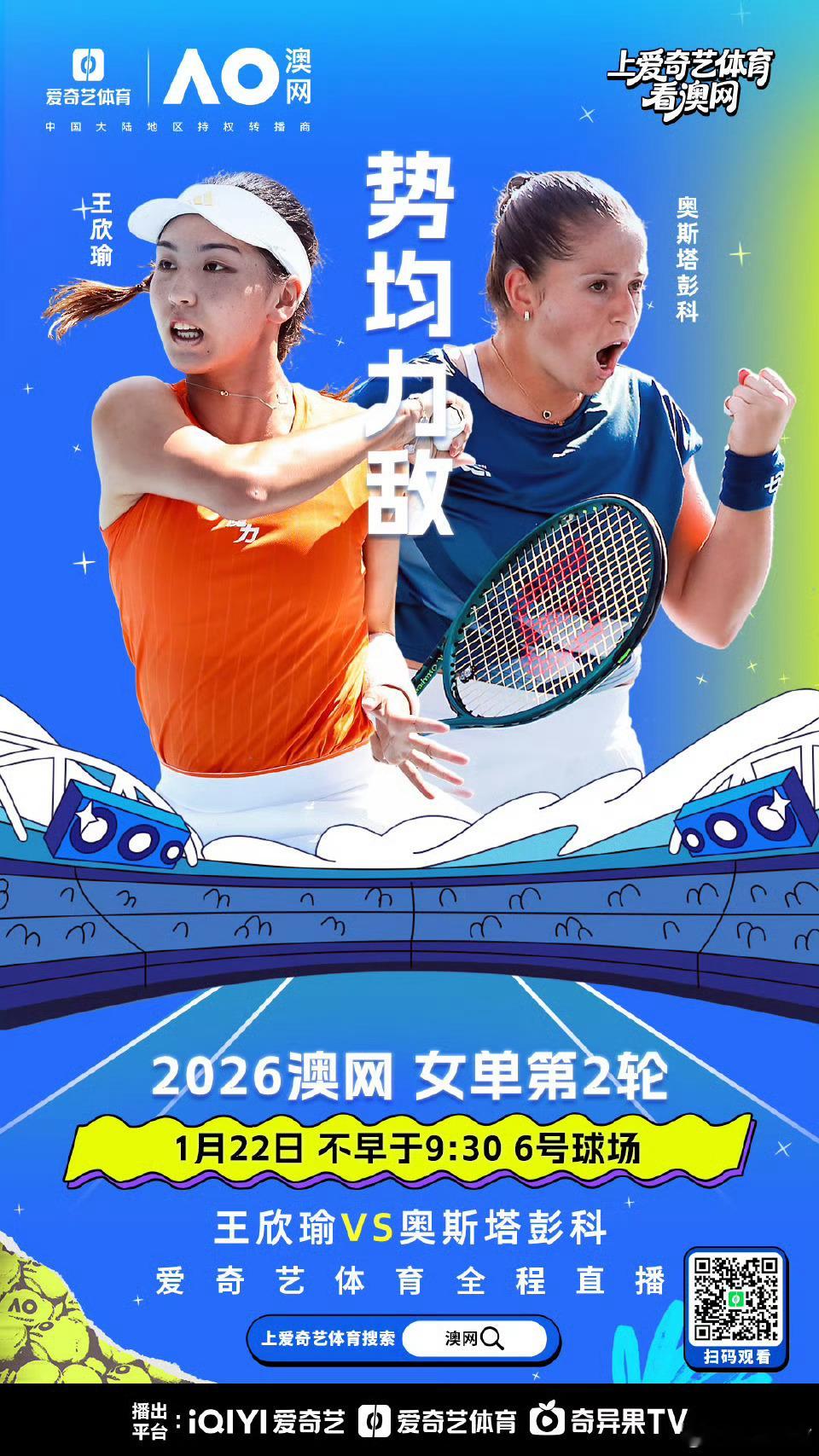 早上好!直播预告。今天上午10:00左右将在跟晶姐搭档解说澳网女单第二轮:王欣瑜vs奥斯塔彭科 。下午14:00左右将接着单口解说另一场女单第二轮的比赛:斯瓦泰克vs布兹科娃 。一起上爱奇艺体育看澳网 给中国军团加油!