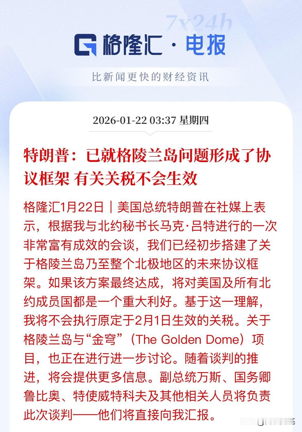 一觉醒来,“格陵兰岛”达成协议,大反转,市场紧张的情绪缓了一口气了,超出市场预期了,现货黄金暴跌100美元,现货白银直接从95美元跳水至90美元,美股盘中再度反转,三大指数全线涨幅超1%,继续欢乐继续嗨 特朗普说和北约已就格陵兰岛达成协议框架了,并不会对2月1日的欧盟加征关税了,市场直接全场开香槟欢呼, 避险资产全线跳水,现货黄金盘中直接从4800多美元直接跌了100美元到4700多美元,现货白银盘中直接跌没了5美元至90美元, 美股三大指数盘中直接迎来大反转,市场避险情绪降温,风险资产再度集体拉升,美股指数全线收涨超1%, 亚太市场开盘也是一路欢乐,韩国综合指数涨幅1.69%,日本股市也是集体高开,今天值得期待了。
