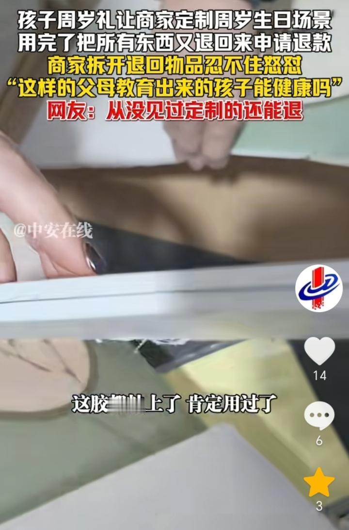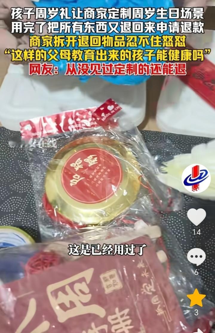 “怎么好意思的?”河南,孩子周岁礼家长在网上给孩子定制了周岁生日场景,结果孩子周岁过后家长竟然把定制的生日场景退给了商家,并且申请了退款,商家看着用过的东西给退回来了,心里怒火也是压制不住了,忍不住怒怼“像这样的父母,教育出来的孩子能健康吗?”。 如果买不起那就不要买,结果买回去都用了还要退货退款,真不知道怎么好意思的,就算嫌贵买的时候就应该讲价,既然买回去用了,那就不能在退了,为了能白嫖脸都不要了,如果这样当家长,那么以后教育出来的孩子确实好不到哪里去。 凡事都要讲一个理字,很明显这件事家长就是不对,商家直接曝光出来也是理所当然,估计换做任何一个商家,都会生气。 “林子大了,什么鸟都有”,人与人之间应该相互理解,少一些算计,多一些善良,像这样的家长,商家就应该实名曝光出来,让大家都认识下。