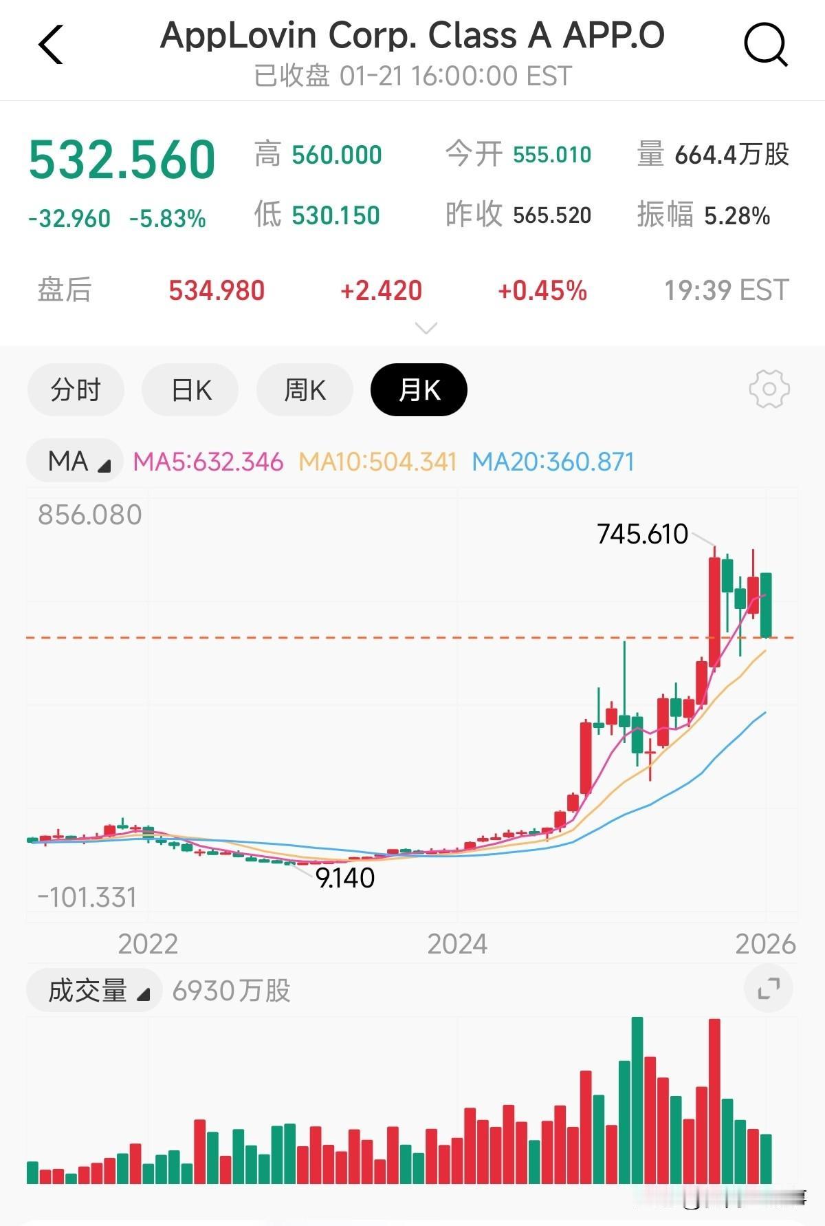 美股的股王不是英伟达,也不是谷歌,而是一家名叫 applovin的 Ai应用公司,其主营业务实际上就是用Ai配对广告,赶上了这一轮美股牛市过去三年这家公司的股价从9 美元飙涨到了740 多美元,上涨80 多倍,这可比英伟达等老登股疯狂多了。最牛的是去年这家公司顶着轮番做空的压力,股价翻了三倍多,让空军也压力山大。