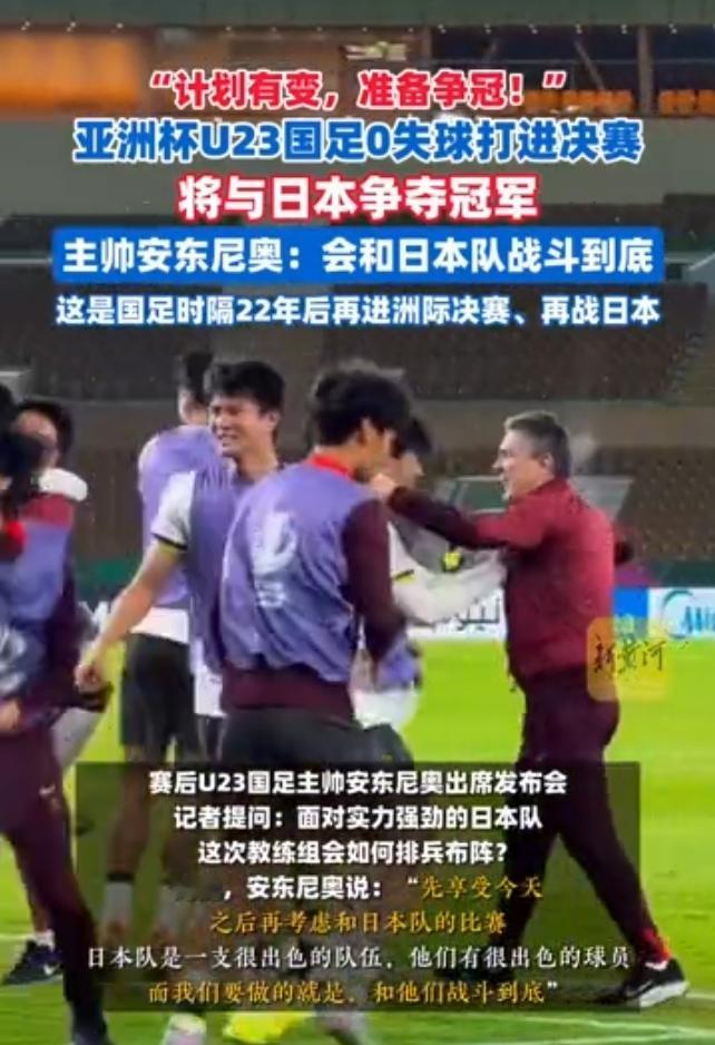 U23中日两强争霸,谁能笑到最后? 1月24日,号称最强盾遇上最利矛,这场亚洲杯决赛鹿死谁手还真不好说。国足U23一路零失球守到决赛,日本队五场狂轰12球战斗力不俗,针尖对麦芒的较量,注定火花四溅! 回顾U23日本队的进攻一路顺风顺水,射门数赛事第一,佐藤龙之介这位小将更是锦上添花,边路盘带造威胁的本事更是一绝,不过他们的防守也并非铜墙铁壁,遇上快攻就容易露马脚,恰恰防守是我们的优势。 国足U23表现最亮眼的就是防守,可以说把防守DNA刻进了骨子里,5-3-2阵型摆得明明白白,三条线密不透风,门将李昊更是门神附体,让日本队都捏了把汗。即将到来的决赛,想赢球,就得守好边路不给对手可乘之机,还要防着他们的定位球偷袭,反击时更要速战速决,别跟他们磨洋工,抓准边后卫的空当打反击才是王道。 无论当前中日政治关系如何,两国民间的感情如何,赛场上讲的是狭路相逢勇者胜,日本队想破咱的零失球纪录,咱国足也想踩着卫冕冠军创历史。安东尼奥说要战斗到底,这群小伙子的拼劲咱看在眼里! 1月24日23点,就看谁能棋高一着,笑到最后!