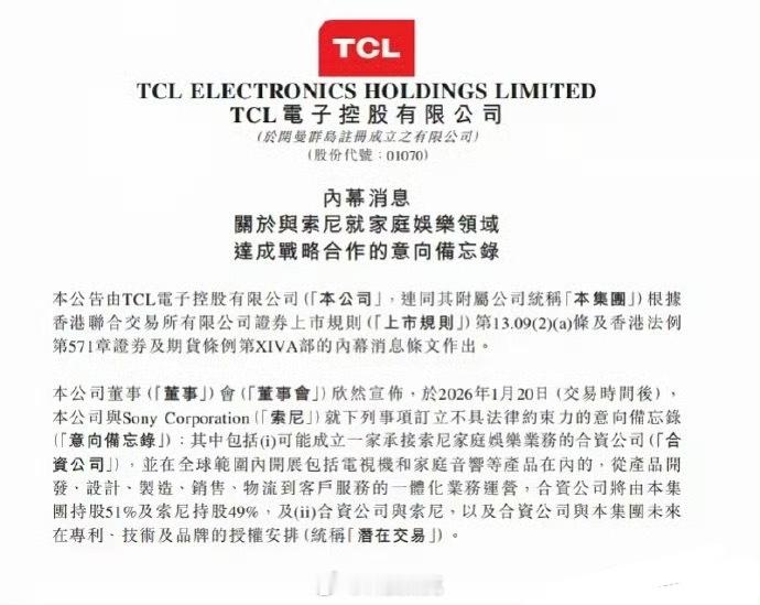 如何看待索尼电视牵手TCLSony和TCL双方成立一家合资公司,共同运营包含电视在内的影音业务,其中由TCL主导,占股51%。大家觉得TCL是吞并还是接盘