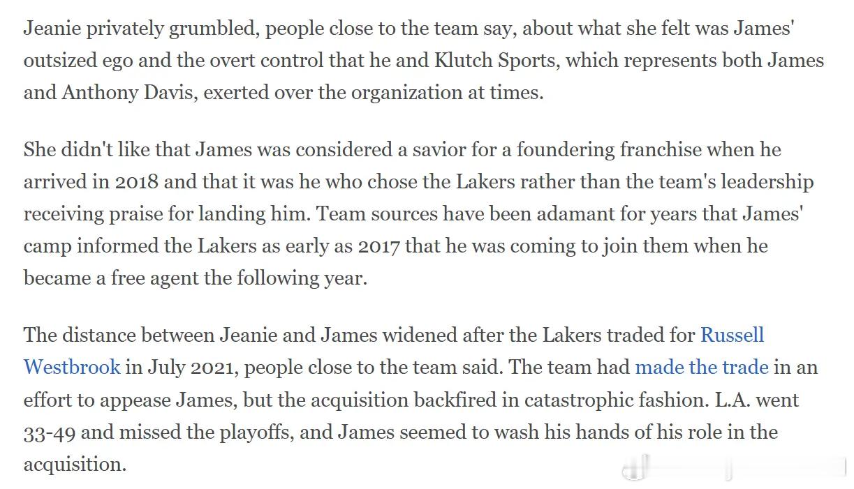 ESPN:珍妮-巴斯对詹姆斯态度逐渐转冷,认为詹姆斯对他的“个人影响力与自我意识过于膨胀”等等湖人老板珍妮-巴斯近年来在内部对詹姆斯的态度逐渐转冷,原因涉及权力边界、更衣室观感以及球队决策等多个层面。报道披露,巴斯的不满主要集中在以下几点:-认为詹姆斯对他的“个人影响力与自我意识过于膨胀”-觉得Klutch Sports对球队事务施加了过多影响-不喜欢外界将詹姆斯视为“拯救湖人的救世主”-对威斯布鲁克交易后的责任归属问题感到不满-私下曾考虑不再为詹姆斯提供续约,甚至讨论过交易他的可能性-认为詹姆斯并未对湖人选中布朗尼-詹姆斯表现出足够的感激-最终仍勉强同意续约,主要担心拒绝续约会带来严重的公关风险原文:“据接近球队的人士称,珍妮-巴斯私下抱怨詹姆斯“过度膨胀的自我”以及他和Klutch Sports在某些时候对球队施加的明显控制。她不喜欢外界把詹姆斯在2018年来到湖人视为“救世主”,也不喜欢外界觉得是詹姆斯“选择了湖人”,而不是湖人的管理层“成功招募”了他。多年来,球队消息源一直坚持:詹姆斯阵营早在2017年就告知湖人,他会在次年成为自由球员时加盟。珍妮-巴斯与詹姆斯的距离在2021年7月交易来拉塞尔-威斯布鲁克之后进一步拉大。球队为了取悦詹姆斯推动那笔交易,但结果灾难性失败:湖人33胜49负无缘季后赛,而詹姆斯似乎又把自己在推动交易中的角色撇清了。据知情人士称,珍妮-巴斯私下对他“缺乏担当”、以及在威少交易后“把责任甩给别人”的方式感到不满。2022年,在威少交易的余波中,多位人士说珍妮-巴斯私下琢磨过:不给詹姆斯续约;同年晚些时候甚至琢磨过交易詹姆斯,甚至有人提到把快船作为可能去处。(这发生在詹姆斯2024年7月签下2年1.04亿美元新合同、拿到交易否决权之前。)而当湖人在2024年选秀大会用第55顺位选中詹姆斯之子布朗尼时,据接近球队的人士称,珍妮-巴斯私下评论:詹姆斯应该对这一举动心存感激,但她感觉他并没有。那年夏天,当她讨论詹姆斯的新合同时,她似乎更像是在接受一个事实:必须续约——几乎是带着勉强,因为如果不续约,公关层面会遭遇巨大反噬。” 珍妮-巴斯声明:“考虑到勒布朗为湖人做出的所有伟大贡献,把他牵扯进我的家庭纷争里,真的不应该。说我们没有感激他,这是完全不真实的,也对他非常不公平。”
