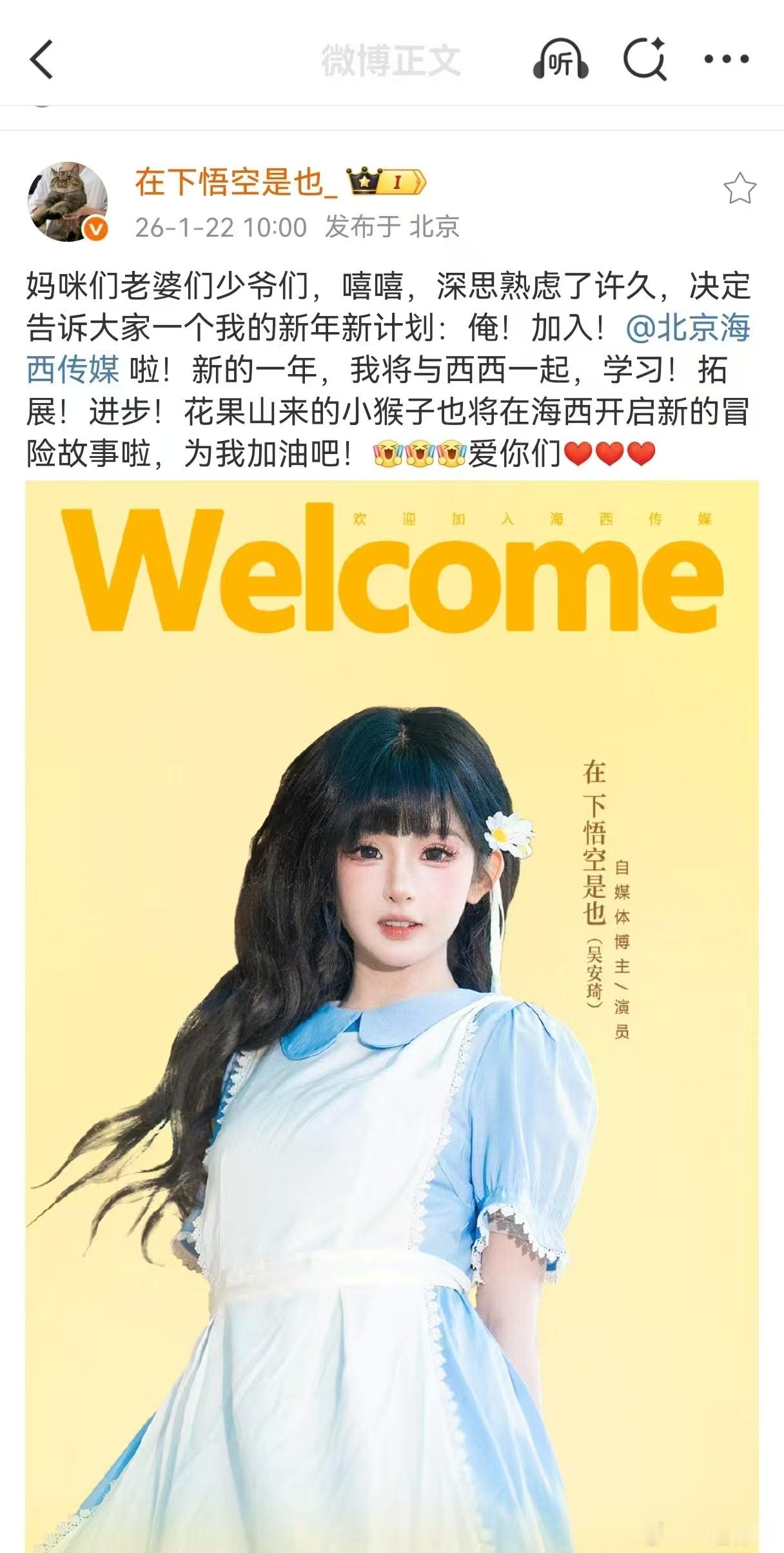 在下悟空是也签约海西传媒 在下悟空是也签约成为演员了!平时刷到她真的是超真诚,现在也要进军影视行业,从coser转演员了,真的期待住了,希望日后多多给我们带来好的作品!