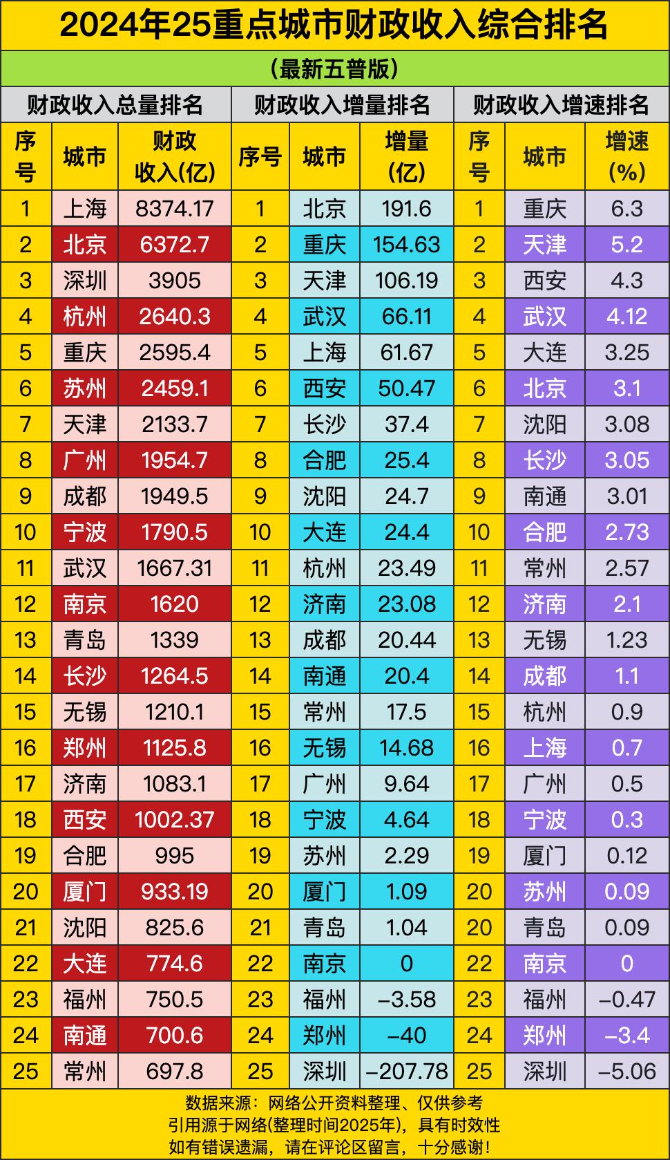 上海那叫一个财大气粗,稳稳坐在第一的宝座上,财政收入高达8374.17亿,简直是城市里的“土豪大哥”。北京紧随其后,也不容小觑。深圳、杭州、重庆这些城市也都名列前茅,在赚钱这件事儿上相当有一手。不过,排名靠后的城市也别灰心,毕竟赚钱这事儿,谁都可能逆袭嘛。 再看看财政收入增量排名,北京这次表现亮眼,增量达到了191.6亿,成了增收的小能手。重庆也不差,154.63亿的增量紧跟其后。上海呢,虽然总量大,但增量只有61.67亿,在这方面稍显逊色。其他城市也都在努力往前赶,有的进步神速,有的就稍微慢了点,这就像是一场没有硝烟的财富争夺战啊。 接着说说财政收入增速,重庆以6.3%的增速一马当先,活力满满。天津和西安也不错,分别有5.2%和4.3%的增速。而深圳就有点尴尬了,增速居然是 -5.06%,在众多城市里显得格外扎眼。看来深圳得加把劲儿了,不然可就要被其他小伙伴超过啦。 从整体来看,这些城市的财政收入情况真是千差万别。有的城市凭借自身优势赚得盆满钵满,有的还在苦苦追赶。不过,这排名也不是一成不变的,说不定哪天某个城市就突然发力,给大家一个大大的惊喜呢!咱就拭目以待,看看接下来这些城市在财富赛道上还会有怎样精彩的表现吧。