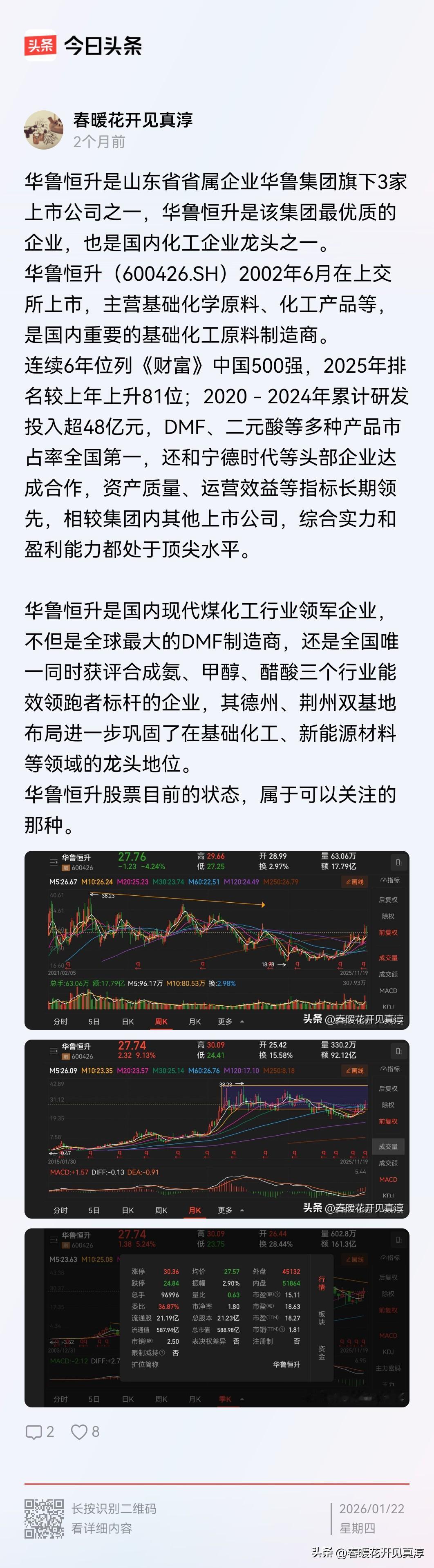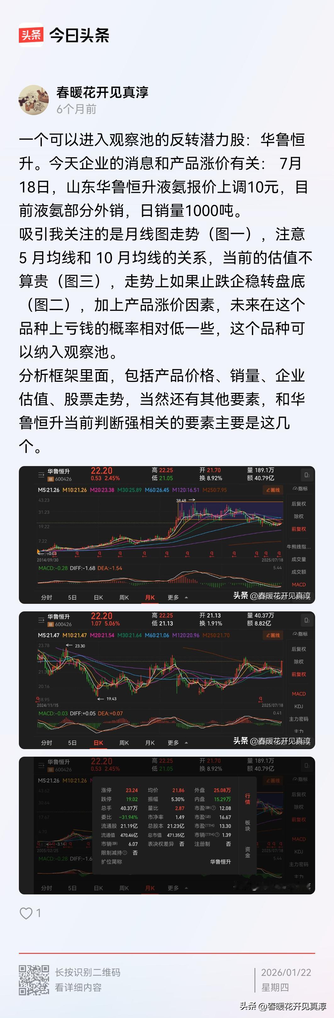 化工股最近走强,华鲁恒生快要新高了。翻了一下之前的帖子,在2025 年 7 月中旬第一次分享的时候是 22 块多,到现在有 60% 以上涨幅了。 我分析华鲁恒生的整个过程在头条上有记录,有兴趣的朋友可以自己去找一下,看看从开始发现到后面的持续的观察和判断,到底是怎么回事儿。 化工股走强是相对确定性的逻辑,走到今天一点也不让人意外。 如果说投资机会的话,半年前一定比现在要好。如果说投资效率的话,不得不说,等涨起来之后的投资效率会远远大于在坑里埋伏。 有色板块里面包括黄金股、铜业股以及小金属股票,在它不涨的时候,其实很少有人有耐心一直等待。昨天我们提到山东黄金、盛达资源,他们作为黄金和白银的龙头股,在拉出新高之后,目前已经持续的在往上走。 江西铜业和云南铜业在去年的中间其实也是不涨的,他们的上涨好像是在 10 月份左右才开始相对确立趋势。 券商股更不用说,很多人把券商股叫做“渣男”不是没有道理,有朋友买光大证券就非常痛苦,另外像中银证券、长江证券、中信证券这些传统券商股票,2025 年应该给了很多人一个不好的体验,尤其像中银证券涨上去再下来,说不定很多朋友是在涨起来之后买入的,那么就有可能已经被套牢了,然后去看有色股票,然后去看人工智能相关的股票,会非常痛苦。 所以这也有可能会像 2012~2015 年那样,12 年到 14 年先涨创业板,然后 14 年底到 15 年涨的传统股票,15 年之后是消费股崛起,板块轮转。 我们需要观察的就是进入哪一个大周期的品种去持有相当一段时间,以及备选哪些品种,这是我们日常要去研究的。