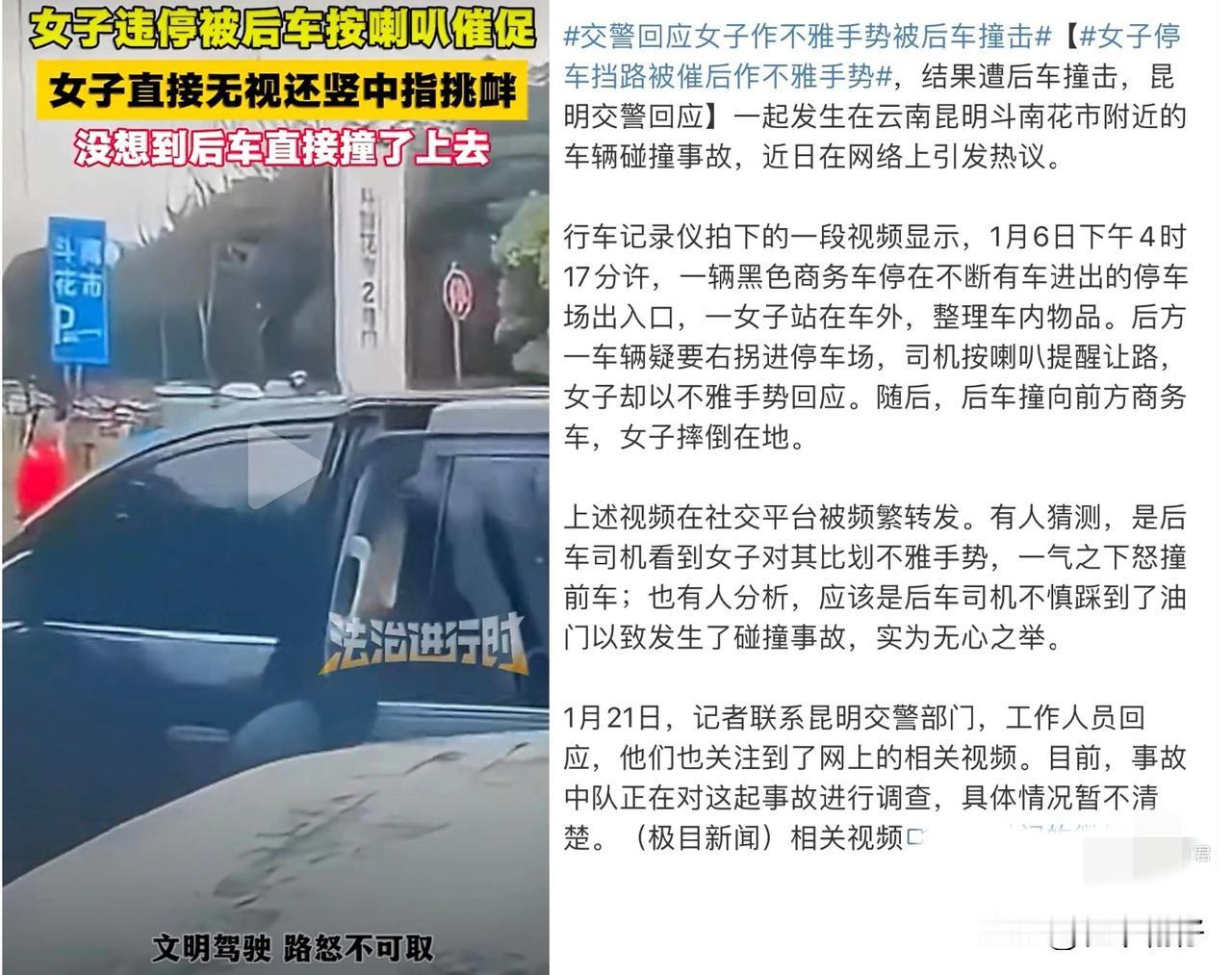 社交平台被频繁转发行车记录仪拍下的一段视频,视频显示昆明斗南花市附近一车流密集的停车场一名女子驾驶黑色商务车违规停放在通道处整理物品,导致后方车辆无法通行。后车多次鸣笛提醒,女子拒绝挪车,并转身朝后车司机竖中指挑衅,整个过程被后车行车记录仪完整记录。 随后,后车司机自称因气愤欲报警,在弯腰捡拾滑落手机时“误踩油门”,车辆前冲撞上商务车尾部,造成该女子摔倒(膝盖与手掌擦伤)及两车受损。肇事司机主动承认责任,并表示愿通过保险进行赔偿。 昆明交警1月21日回应,已介入调查并调取行车记录仪视频,目前责任认定仍在进行中。警方重点核查后车司机是否属于故意行为,包括分析撞击前车辆轨迹及油门开度等数据。同时指出,涉事女子的违规停车与侮辱手势均涉嫌违法。 此事引发公众广泛讨论。多数批评指向女子的违停与挑衅行为,认为其是冲突的主要起因,“规则破坏者应承担责任”。也有部分观点对“误踩油门”的解释表示质疑,认为若经查实属故意撞击,则应依法追究相应责任。此外,亦有声音指出,人在情绪激动时容易出现操作失误,误操作的可能性确实存在。 该事件同时折射出公共场所行为规范、情绪管理与交通礼仪等问题,目前警方正在进一步调查中。