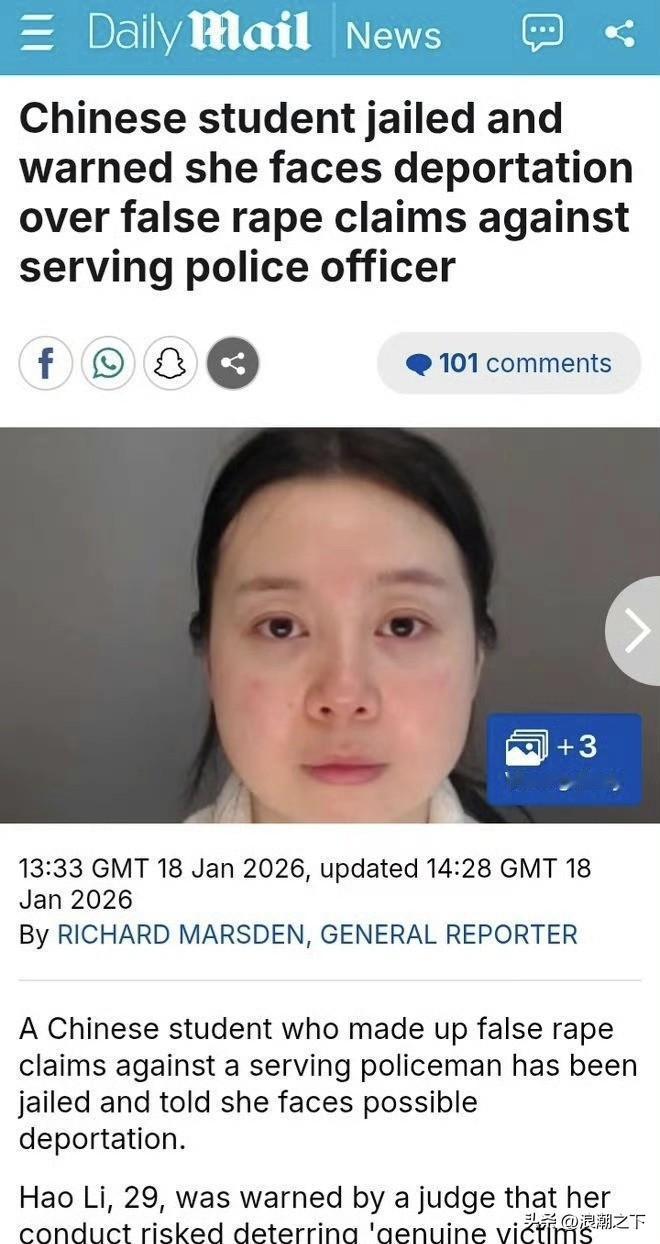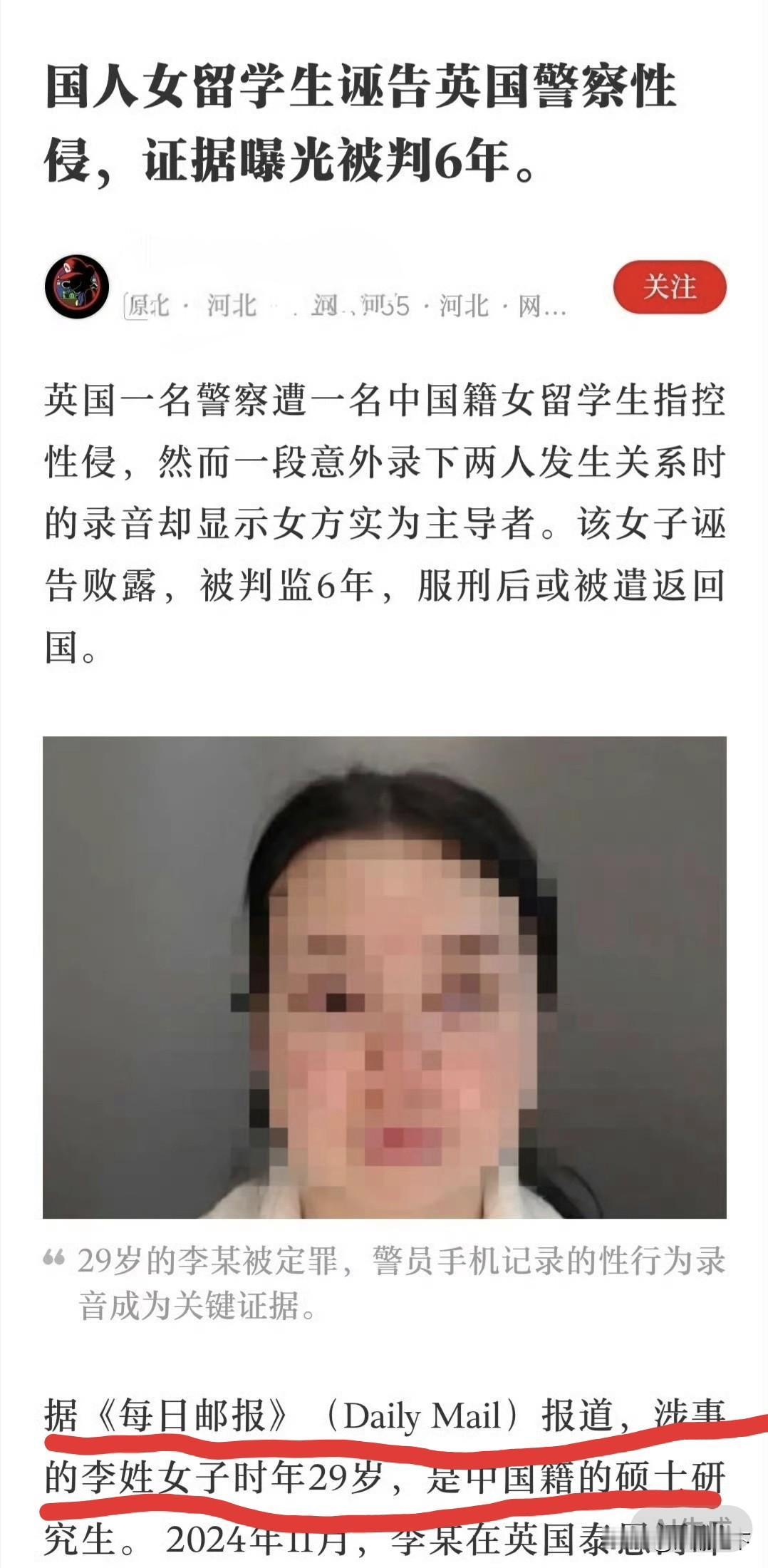 屡试不爽的技能…在国外竟然水土不服啊[笑哭]就喜欢外国把犯人的名字照片公布出来的做法!如果不是该警察在事前偶然录下双方对话,或者如果这事发生在中国,情况估计就完全不一样了,至少那个中国仙女报绝逼会带头煽情,一大帮拳师跟进。 小仙女:国外怎么没有知心大姐姐啊[吐舌]?你猜她图什么?一是图能顺利入籍,若不顺利就反告来敲诈。可惜这女子把某些人在中国用的方法搬到英国,也没有看看当地的国情,人家那里的知心姐姐与她不知心。 参考了其他消息,这个留子刚出事儿后趁着证据不足离开英国了,结果过段时间自己觉着没事儿了又返回英国了,这期间那个警察找到了决定性证据,女留子一进海关就被抓了[捂脸]。 这事真是开了“国际玩笑”,开大了!