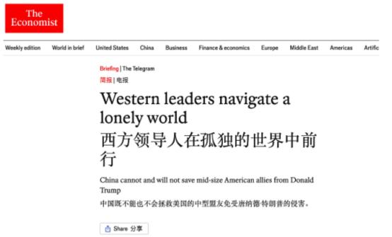 简直不敢相信英国人写的东西,太辣眼睛了——“中国既不能也不会拯救美国的中型盟友免受唐纳德·特朗普的侵害”——这是英国《经济学人》的文章副标题,大标题是《西方领导人在孤独的世界中前行》。然后,配图简直了,看见灯塔没——有两座灯塔,美国那盏熄火了,中国灯塔则以温暖的光束照耀着——哈哈,照耀着带有英国跟加拿大国旗的两艘小船。   这画面摆出来,不是给自己找尴尬吗?英国人写这文章,说白了就是自己心里慌了,又拉不下脸说实话,只能靠这种阴阳怪气的文字和配图找存在感。   他们心里比谁都清楚,现在西方盟友体系早就不是以前那样铁板一块了,最大的问题就出在美国身上,出在特朗普身上。   最近在瑞士达沃斯的世界经济论坛上,美国和欧洲盟友、加拿大闹得不可开交,互相指责谩骂,这可不是编的,是全世界都看着的真事。   特朗普现在对自己的盟友,那是一点情面都不讲,眼里只有美国的利益,甚至还动起了吞并盟友相关领土的心思。   就在几天前,他在社交媒体上发了图片,暗示要把格陵兰岛、加拿大都划进美国领土,还说为了得到格陵兰岛,这事没有回头路,连是否会用武力夺取都不肯否认。   这种赤裸裸的领土扩张想法,直接把欧洲和加拿大吓住了,也彻底寒了盟友的心。   面对特朗普的强硬施压,欧洲领导人敢怒不敢言,还被美国加州州长嘲讽“软骨头”,说他们面对特朗普只会屈服,连点骨气都没有,甚至建议给他们戴上护膝,方便“下跪”。   法国总统马克龙实在忍不住了,在达沃斯公开指责美国在试图削弱欧洲,把关税当成施压领土主权的工具,还说欧洲更喜欢尊重而非霸凌,明确表示不会接受美国用武力和霸权定下的世界秩序。   加拿大总理卡尼更是直接,批评美国把关税当武器、把金融设施当胁迫工具,直言基于规则的旧秩序已经终结,再不清醒就会成为别人的盘中餐。   就是在这种背景下,英国人写出了这篇文章,还配了那样的图。他们心里清楚,美国这个靠山现在靠不住了,甚至还会反过来欺负自己这些盟友。   但作为西方阵营的一员,他们又不愿意承认西方体系内部已经分裂,更不愿意放下身段正视中国的国际地位,只能拐弯抹角地提中国,还嘴硬说中国既不能也不会拯救他们。   说句实在话,中国从来就没有想过要“拯救”谁,也没必要去拯救谁。每个国家都是主权独立的,美国和它的盟友之间闹矛盾,那是他们自己的内部纠葛,是特朗普的霸权政策引发的分歧,跟中国没有关系。   中国一贯的态度就是互不干涉内政,合作共赢,不会去掺和别人的恩怨,更不会当谁的“救世主”。英国人说中国“不能也不会拯救”,这话其实没说错,但用在这个语境里,就是故意找补,本质上是自己焦虑又无能的表现。   再看看配图里的加拿大,人家现在可比英国务实多了。就在前不久,加拿大总理卡尼刚访问完中国,两国签署了经贸合作路线图,这是中加双边经济关系史上首份高水平合作文件,涵盖了能源、农业、清洁能源、先进制造等多个领域。   之前困扰双方的贸易壁垒也在逐步消除,加拿大允许每年最多4.9万辆中国电动车以优惠税率进入其市场,中国也同意降低加拿大油菜籽进口税率,还会取消部分农水产品的反倾销措施。   2025年1到11月,中加货物贸易进出口额就达到了5886.2亿元,双方合作是基于平等互利,不是谁求谁、谁拯救谁。   加拿大之所以这么做,就是看清了现实。跟着美国混,不仅得不到好处,还可能被美国当成牺牲品,特朗普那句“加拿大能活着只是因为美国宽容”,就是最好的提醒。   而和中国合作,能实实在在拿到利益,给本国企业和民众带来好处,这才是最实在的。反观英国,一边看着美国对盟友步步紧逼,一边又嫉妒中加之间的务实合作,只能靠写文章、画奇怪的图来自我安慰。   现在的西方领导人,确实像《经济学人》大标题说的那样“在孤独的世界中前行”,但这种孤独不是别人造成的,是美国的霸权主义和单边主义逼出来的。   特朗普上台后,动辄对盟友加征关税、威胁制裁,甚至企图抢夺盟友相关领土,把盟友当成自己的工具,这样的情况下,盟友之间的信任早就荡然无存了。   欧洲多国已经开始反击,冻结和美国的贸易协定批准程序,丹麦的养老基金还计划清仓美国国债,这些都是西方内部分裂的铁证。   英国人不敢直面这个现实,就把矛头引向中国,搞出这么一篇不伦不类的文章。他们既怕美国的霸权伤害到自己,又不愿意和中国展开平等务实的合作,只能在文字里纠结,在配图里找心理平衡。   这种自欺欺人的做法,根本解决不了问题。要知道,现在的世界早就不是西方说了算的时代了,靠阴阳怪气和自我安慰没用,只有认清现实,放下身段,用平等尊重的态度和其他国家合作,才能真正摆脱孤独。