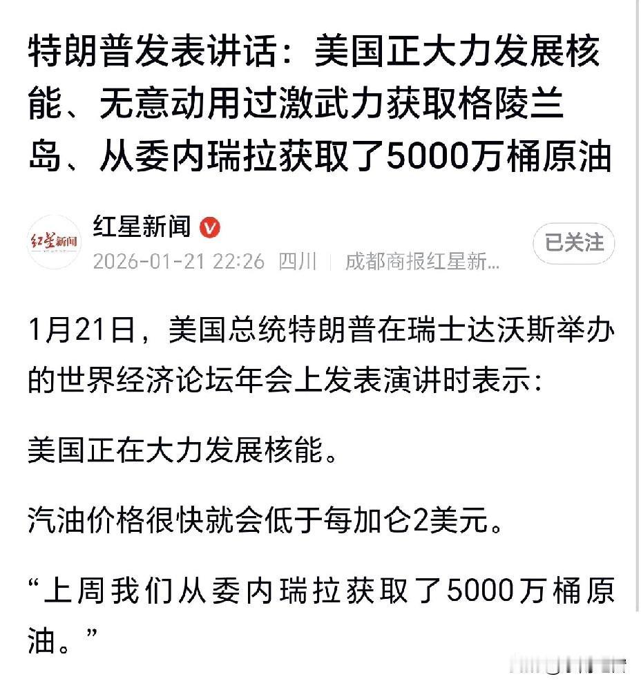 特朗普在达沃斯那叫一个飞扬跋扈,捧着从委内瑞拉薅来的5000万桶原油到处显摆,那嘴脸简直在喊话:你看连委内瑞拉都服帖了,格陵兰岛你还犟啥?嘴上说着不动粗抢岛,转头就骂丹麦忘恩负义,逼着人家坐下来谈收购,明摆着就是看上格陵兰的矿产和北极地盘,拿安全当遮羞布。还逮着欧洲绿能和北约一顿吐槽,满肚子都是霸权小九九,这吃相属实有点太难看了!