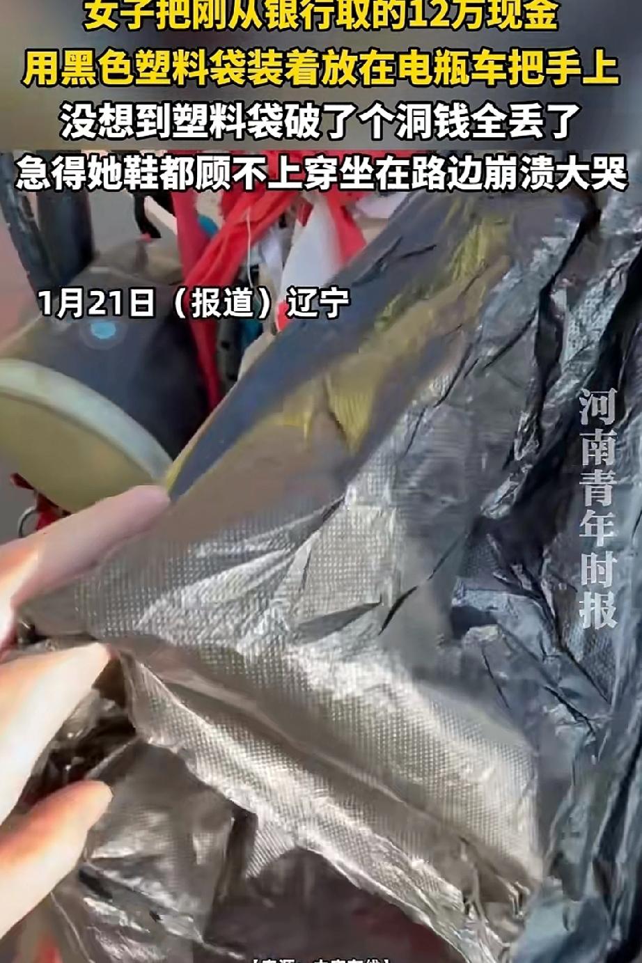 1月21日辽宁一女子为了给儿子装修婚房,兴高采烈的去银行取出了12万现金,就把装有现金的黑塑料袋挂在了电动车把手上,在回家的路上意想不到的事发生了,那装钱的黑塑料不知什么时候破了一个大洞,当女子发现时全部现金早已弄丟了,女子即心疼又着急,坐在路边崩溃大哭连鞋都顾不得穿,不知如何是好? 女子太粗心了,一下取这么多现金,自己应该稍个背包去银行,把钱放里面更安全,为了图省事竟敢把钱装进这么薄的塑料袋里,还挂在车子把上,出现了意想不到的后果,这能怪谁呢?真心希望拾到现金的好心人,能够把这些辛苦钱原封不动的还给女子! 此事一定引以为戒,同时提醒大家长个记性,取现金时万不可马虎大意,以免发生难以预料的事!