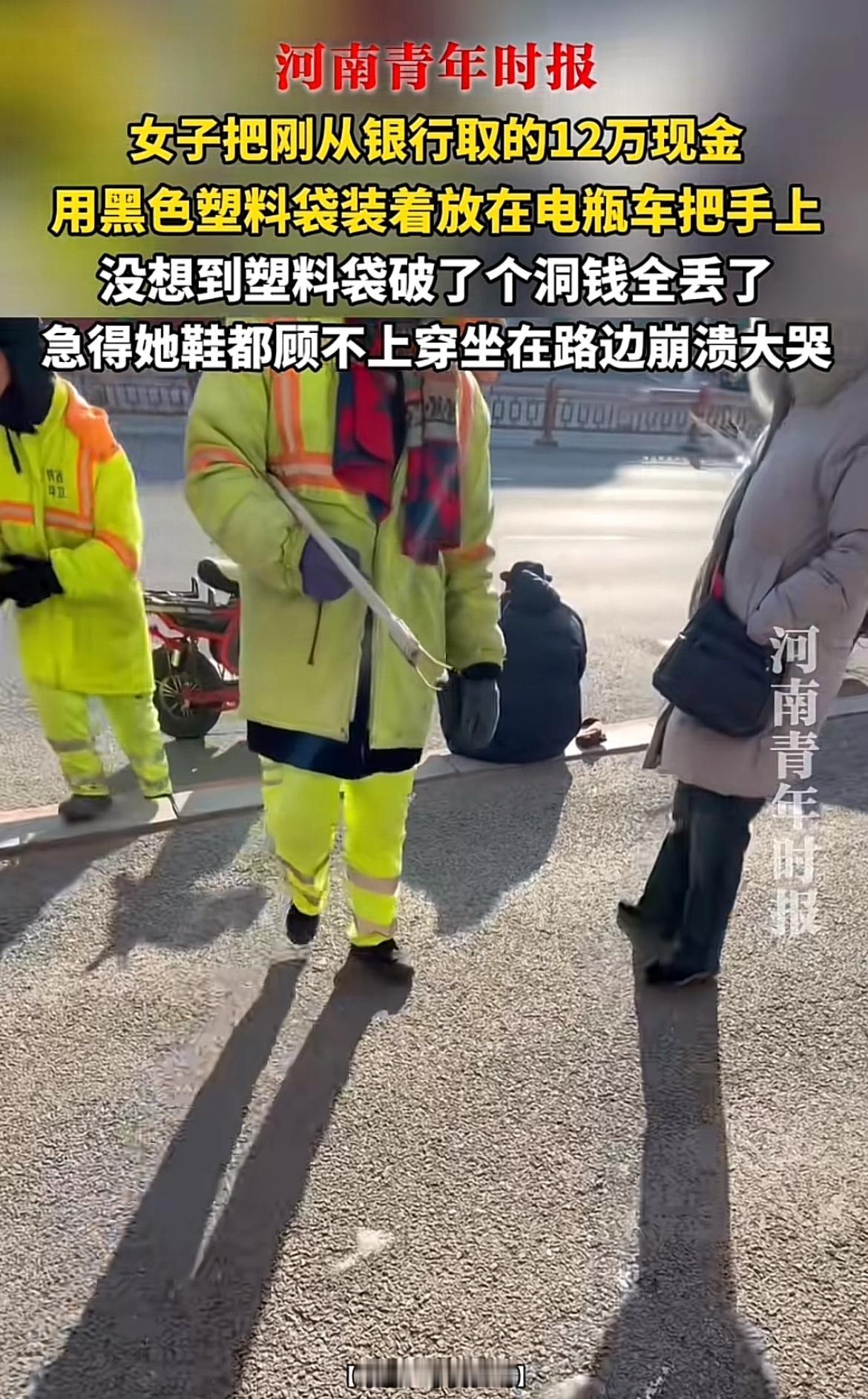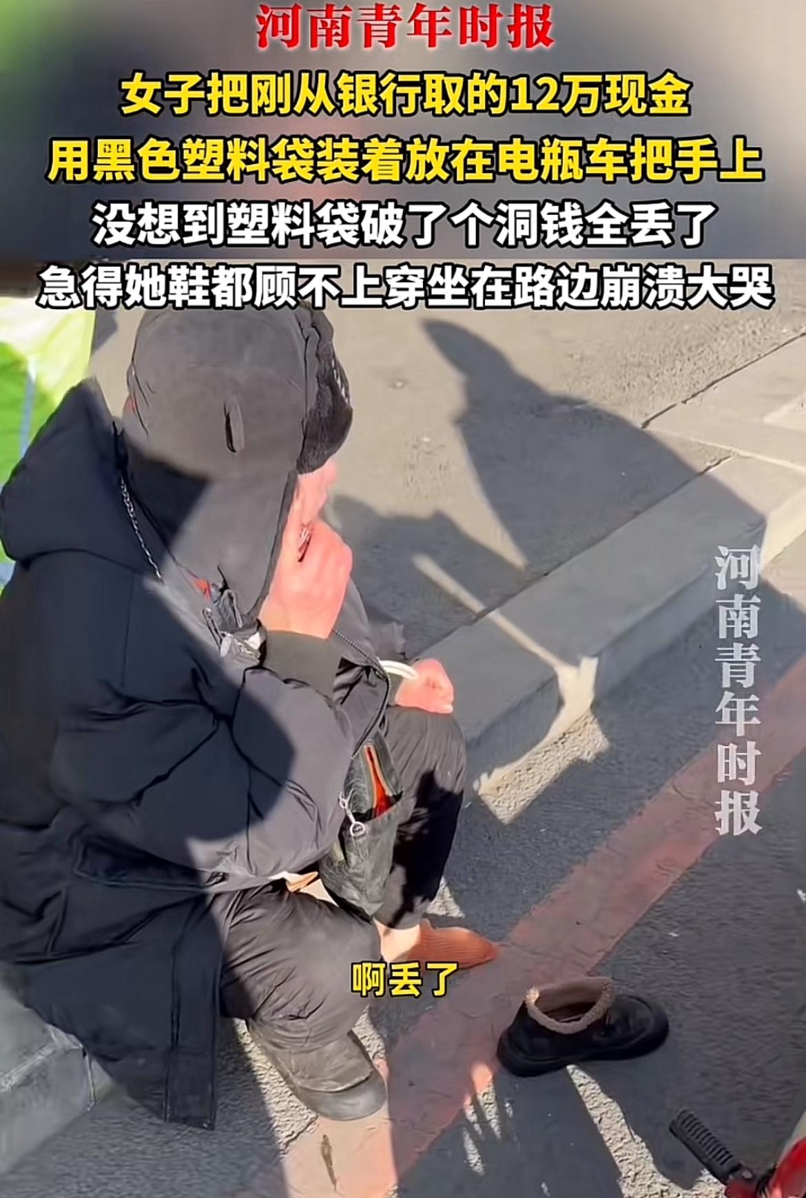 1月21日媒体报道的辽宁这事儿,真让人又心疼又觉得无奈。一女子从银行取了12万现金,就为给儿子买婚房。她把钱放黑色塑料袋里,直接挂电瓶车把手上,结果塑料袋破洞,现金全丢。现场目击者说,实际丢了11.6万元。这女子也够倒霉,刚出银行在第一个路口就被出租车撞了,腿脚都受伤了,接着又发现钱没了,只能无助地坐在路边大哭。网友说得挺逗,“我买一袋橘子也不敢这么挂”。这也给大家提个醒,大额现金可得好好保管啊。