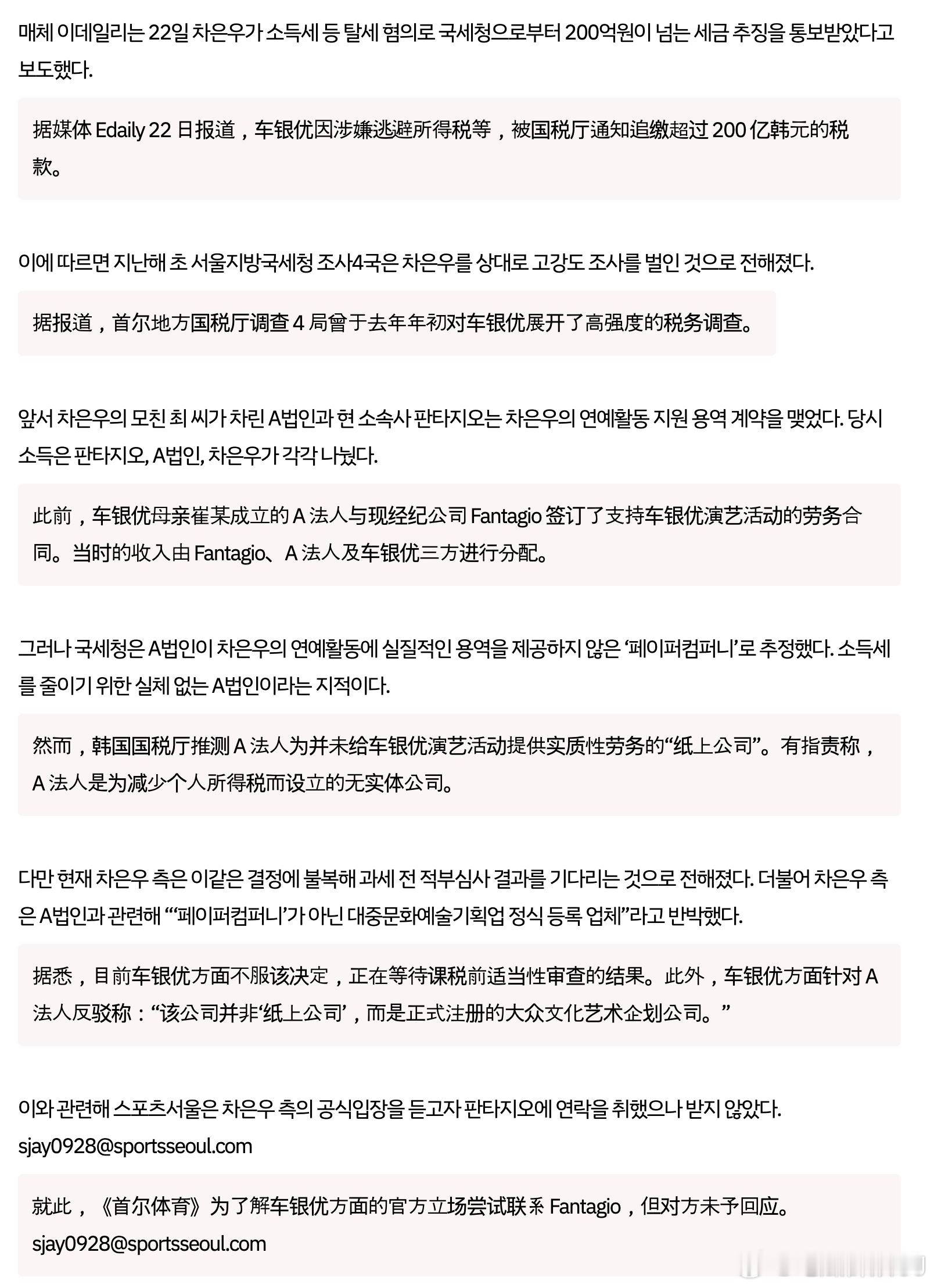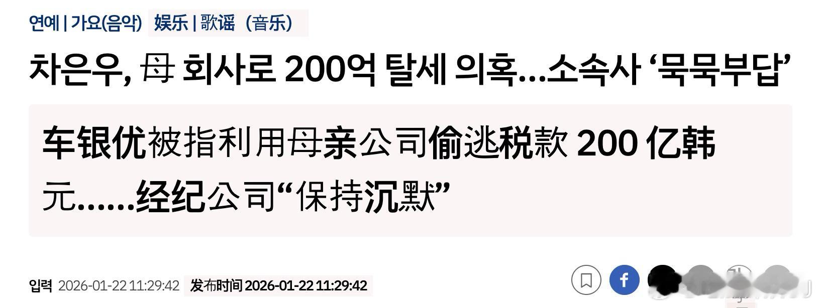 车银优也要塌了?韩媒报道,车银优疑似通过母亲成立的无实体公司逃税200亿韩元,其经纪公司目前没有回应。