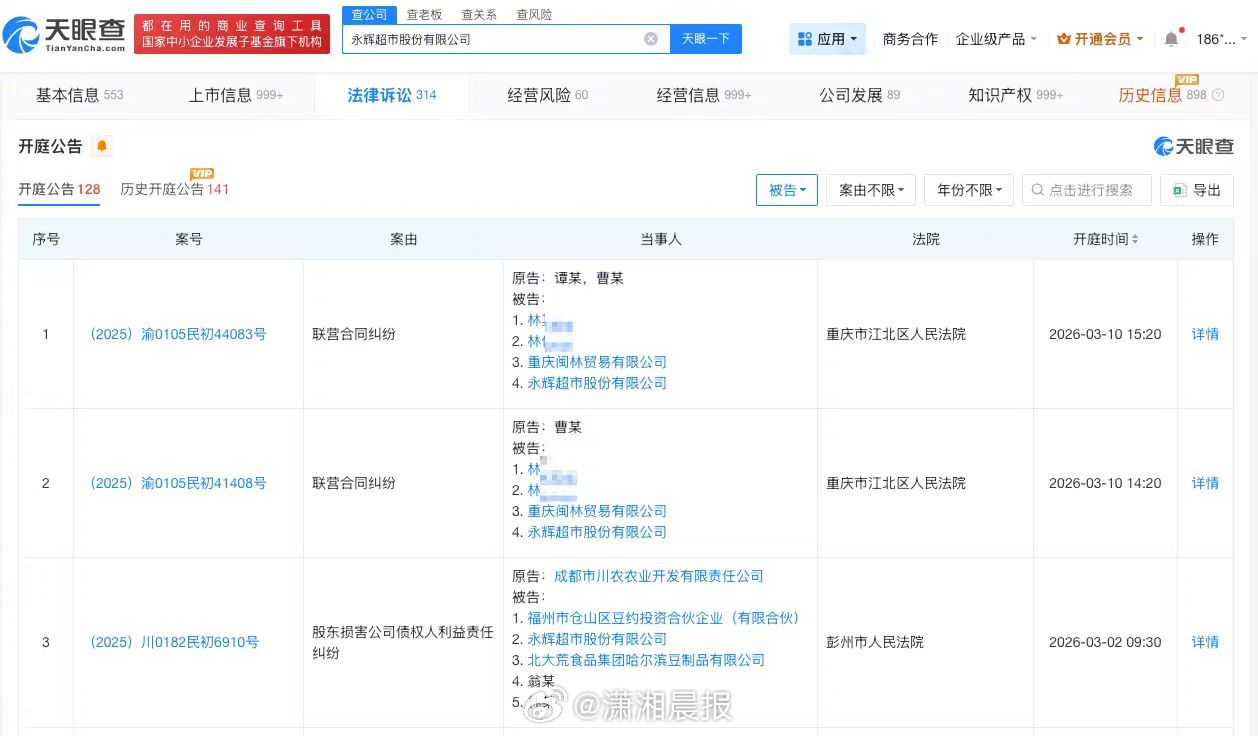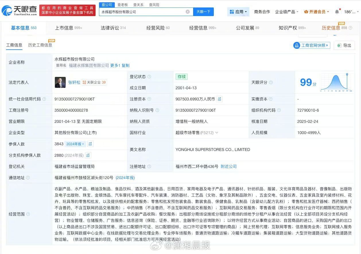 #永辉超市曾涉多起纠纷#【#永辉超市已申请胖永辉商标#】据报道,近日,永辉超市(601933.SH)发布预亏公告,预计2025年归母净亏损21.4亿元。公司称,业绩亏损主要原因是2025年公司进行了重大的经营战略调整。#永辉超市胖改第二年预亏21亿##永辉超市已连续5年亏损#记者查询天眼查工商信息发现,永辉超市股份有限公司成立于2001年4月,法定代表人为张轩松,注册资本90.8亿人民币,经营范围包括网上贸易代理、互联网零售、信息服务业务等。股东信息显示,该公司由张轩松、吴凯之、甘旺亨等共同持股。天眼风险信息显示,该公司涉及多起法律诉讼,案由包括联营合同纠纷、股东损害公司债权人利益责任纠纷等。知识产权信息显示,该公司已申请注册“辉胖”“胖辉”“胖永辉”“胖小辉”等商标,国际分类涉及广告销售、方便食品等,其中,多枚“胖永辉”商标已注册成功。
