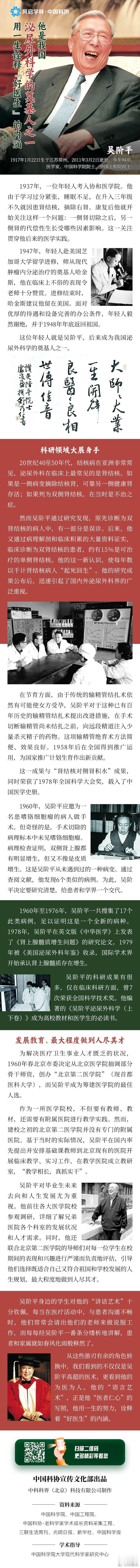 我们隆重纪念中著名的医学家、医学教育家,中国泌尿外科学的奠基人,社会活动家,第八届、九届全国人大常委会副委员长,第九届、十届九三学社中央主席、第十一届中央名誉主席,中国科学院院院士、中国工程院院士,中国科协名誉主席,中国医学科学院名誉院长吴阶平院士诞辰109周年(1917年1月22日-2011年3月2日)“国之大医”吴阶平:“延陵世泽,让国家风”一脉相承作者:陈若葵■ 陈若葵近日,第二十三届吴阶平-保罗·杨森医学药学奖日前揭晓,又一次唤起我们对医学大家吴阶平精湛医术的钦佩和其人格魅力的敬意。身为中国科学院和中国工程院两院资深院士,医学泰斗、教育家,我国泌尿外科的领军人物,“红色御医”吴阶平教授所创造的诸多“第一”,在我国泌尿外科发展史中树立了一个又一个里程碑。父亲的理念成就了一个传奇吴阶平幼年家境殷实、生活幸福。父亲吴敬仪为人正直,注重对子女的教育,在做人、处事、为学等大方向上潜移默化地影响孩子。他教孩子们认字读书,吴阶平6岁时就能阅读《史记·项羽本纪》《三国演义》,10岁前在私塾学习《四书》《五经》,打下了较扎实的古文功底,也从书中学会了待人接物的礼仪和为人处世的规则。多年的商界经历,深谙经商的不易和官场的混乱,吴敬仪希望子女们远离名利场。他让孩子们在学习传统文化的同时,学习数学、英语和科学技术,并为子婿规划了职业方向——学习西医,精通医术,做个治病救人、救死扶伤的好医生。为此,他要求孩子们一定要考入协和医学院。1933年,吴阶平步姐夫、长兄之后尘,进入燕京大学医学预科班,后考入协和医学院。时隔多年,吴老先生的教育理念和殷殷期望,终于成就了我国医学史上的一段传奇——吴家兄弟都已成为各个医学领域的翘楚,独领风骚,他们聚集在一起,能开一家国内顶级医院!这个“强强组合”的“吴家医院”成员除吴阶平外,还有他的大哥吴瑞萍,毕生致力于儿科事业,曾任北京医学院教授、北京儿童医院副院长;三弟吴蔚然,外科专家,曾担任国家领导和重要外宾的保健医生;四弟吴安然,长期从事免疫学病毒学研究,协和医院博士生导师。此外,姐夫陈舜名是外科专家,曾任常州市第二人民医院院长;妹夫蔡如升,心肺内科专家,曾任中国医学科学院阜外医院副院长、博士生导师。而在吴门三代及近亲中,有30余人从医,是当今国内罕见的名医世家。要发自内心地尊重、团结他人吴家兄弟医术精湛,医德高尚,这得益于兄弟们将“延陵世泽,让国家风”家训铭记于心。吴敬仪不仅鼓励孩子们自幼一心向学,还常常以生动的比喻,深入浅出地教导他们:无论求学还是工作,“最重要的是团结,团结起来才能干大事。”他举了个非常形象的例子,“一根筷子一撅就断,一把筷子就折不断”,并且深刻解释其内涵:“团结不是表面上的一团和气,而是那种真心尊重别人的团结,要有一种无私奉献的精神。”父亲还引导他们在与人交往中懂得谦让,不怕吃亏,告诫他们,忍让有时候如同过独木桥,两个人都有要紧事要过去,但桥上只能容纳一个人,在这种情况下,你就先让他过去,千万不要两个人争抢,那样有可能两个人都掉到河里,欲速则不达。所以,有时的忍让只是一种表面现象,实质是经过缜密的思考、策划,欲进则退,绕过障碍达到目的。正是父亲这些谆谆教诲中蕴含的人生哲理和高风亮节,成就了吴氏兄弟勤钻研、重信义、随和低调、顾全大局的品格。吴阶平有句名言:“三思方举步,百折不回头。”在他看来,医生要有精湛的医术、高尚的医德、负责的精神、高度的同情心,还要懂艺术。作为医生,他完美地诠释了“医者仁心”的含义。吴阶平曾动过6次大小手术,先后12次住院治病,身上的手术刀疤加起来有两尺长。正因为如此,他对病人的痛苦、家属的心情感同身受。他认为医生除了专业知识,还要懂心理学、社会学、经济学,讲究服务的艺术,对患者和家属春风化雨,才能发挥病人的积极性,取得家属的合作,提高治疗效果,利于病人康复。循循善诱 用爱温暖孩子在吴炘、吴冰、吴德绳姐弟三人的记忆中,家是和睦、幸福的,父母的关爱无时不在。“无论爸爸妈妈在国内、国外、出差或在农村劳动,我们每周都能收到爸爸妈妈合写的家书,字里行间渗透着浓浓的亲情,给我们带来了无限温暖。”传承吴敬仪对子女循循善诱的教育方式,吴阶平也在充满爱的氛围中,以说见闻、讲故事、拉家常、介绍自己亲身经历的方式,润物无声地教育、影响孩子。由于工作、科研繁忙,吴阶平和孩子们聚少离多,但他家有一个不成文的“规定”——周日早晨全家一起吃早点,这是一家人幸福的餐桌聚会,被戏称为“早餐会”,也是姐弟三人快乐的时光,“我们最喜欢听爸爸讲他的见闻,包括他处理事情的过程以及感受。虽然每次只讲一两件事,但我们却能领会到他的深意。”吴德绳介绍,在一次“早餐会”上,父亲讲起他参观一个国家的医学院时,看到其图书馆前挂着“判断病情而无书指导,犹如航海而无航标”的标语,父亲觉得这句话意犹未尽。之后在瑞士访问时,他终于在图书馆查到那幅标语只是加拿大医生兼医学教育家威廉·奥斯勒原话的前半句,后半句是:“有书不看病人,则如举着航标岸上行。”查到这句话时,父亲特别高兴。他说,两句合起来读,就很完整,其实质是强调知识和实践结合的重要性。吴