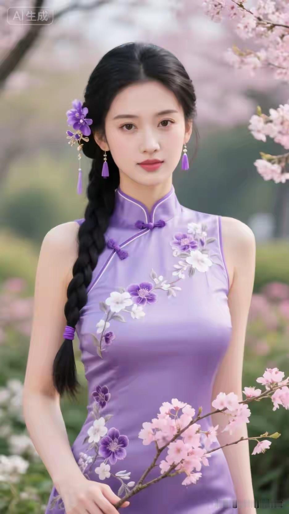 东方旗袍,历史传承。 国风古韵,精彩纷呈。 贴身裁剪,凸显性感。 紫色无袖,花卉刺绣。 江南水乡,流动风景。 千娇百媚,如痴如醉。 一袭旗袍雅韵生 紫底兰花沾风情。