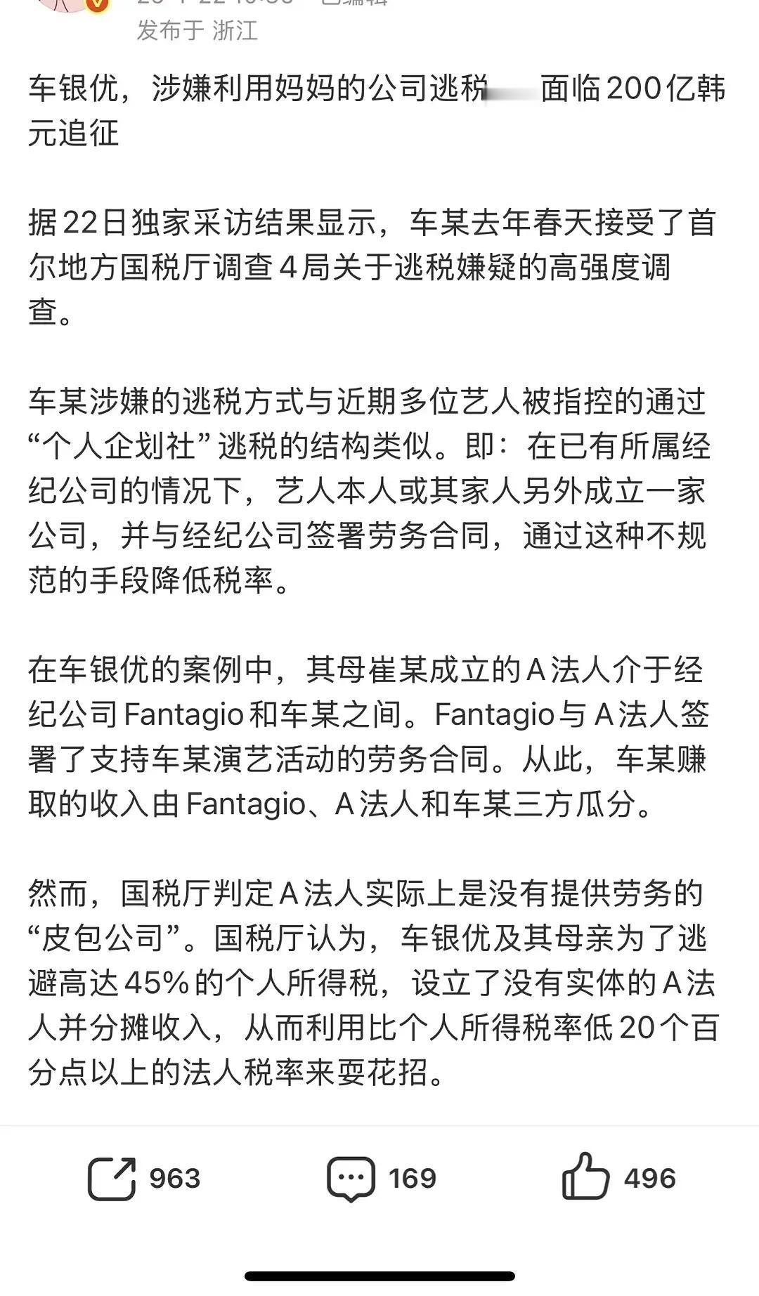 车银优逃税200亿韩元,将近人民币1亿了! 他本身有自己的经纪公司,再通过母亲公司和经纪公司签服务合约,可是,母亲公司并没有实际业务,但是这样就能够逃脱45%的个人所得税。 就和内娱之前差不多,用公司税率规避个人税率,韩国个人税率和中国都一样是45%。 韩国当红代言多的明星也真的很赚啊,算下来税前1000亿韩元,正常税后550亿韩元,逃税后是750亿收入。 对于韩国来说,估计是历史逃税最高的艺人了,这个真是历代级,比柳演锡宋慧乔李荷妮加起来还多。 小韩没有封杀一说 ,但对车银优这种只有脸和资源堆砌没有演技和实力的人来说, 200亿很致命。