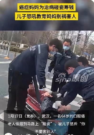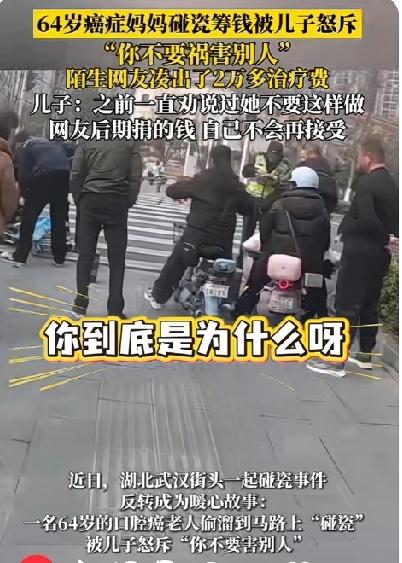 64岁患癌妈妈碰瓷凑医药费,本是道德沦丧因为儿子的一句“别祸害别人”成了陌生人纷纷捐款的温情接力! 2026年1月,湖北武汉的一则视频刷爆网络,64岁的口腔癌老人街头碰瓷货车,被儿子熊先生当众怒斥“你不要害别人”,就因为这一句话让本该备受责骂的事件演变成了,众多陌生人纷纷捐款的温情接力。 熊先生的母亲去年7月确诊口腔癌,后续癌细胞转移至脑部,母子俩从黄石转院到武汉,在医院附近租房养病。35岁的熊先生是单亲家庭长大的孩子,小学毕业后便辗转谋生,送外卖、摆地摊样样都做,却始终没能攒下积蓄,母亲每月3000多元的退休金和医保报销,仍填不满持续的治疗费窟窿,报销后家里已实打实花了11万余元。 眼瞅着儿子已经35岁了还没有结婚,就连辛苦挣来的钱都花在了自己身上,熊先生的母亲很是心疼。多次表示,钱花光了就不治了,自己走了就是给儿子减轻负担。 在1月17日中午,趁着熊先生准备午饭时,她趁其不备溜出出租屋,故意在货车前摔倒碰瓷制造交通事故。接到交警电话后,心急如焚的熊先生赶往医院,却发现母亲仅有脚腕轻微磕碰,调取监控后证实,货车根本没有撞到老人。在熊先生的追问下,口齿不清的母亲终于承认,见货车有保险便动了歪心思,想碰瓷讹钱凑治疗费。 病床前,熊先生又气又急地训斥母亲:“别人也有家庭要养,你不要祸害别人!再困难咱也不能害人啊!”他将这段视频发布到网上,本意是提醒路人避让,却没想到视频播放量超千万。意外的是,网友们非但没有苛责老人,反而心疼这对母子的困境,纷纷主动询问捐款渠道,1元、10元、50元的小额转账不断涌来,很快凑齐了2万余元治疗费。熊先生也表示,网友们后续捐的钱他不会再接受! 64岁老人的碰瓷行为肯定是错的,既危险又违法,但是但凡老人还有别的办法,她也肯定不会怎么做。她主要是想为儿子减负,这背后是深深的母爱;熊先生的怒斥,不是不孝,而是守住了“不损害他人”的道德底线,这份清醒在困境中尤为可贵。 世间的善从不是非黑即白,面对困境时的坚守、面对他人难处的体谅,才是最动人的底色。这起事件也提醒着我们,道德的底线不可破,而人间的温情,永远能为困境中的人撑起一片天。