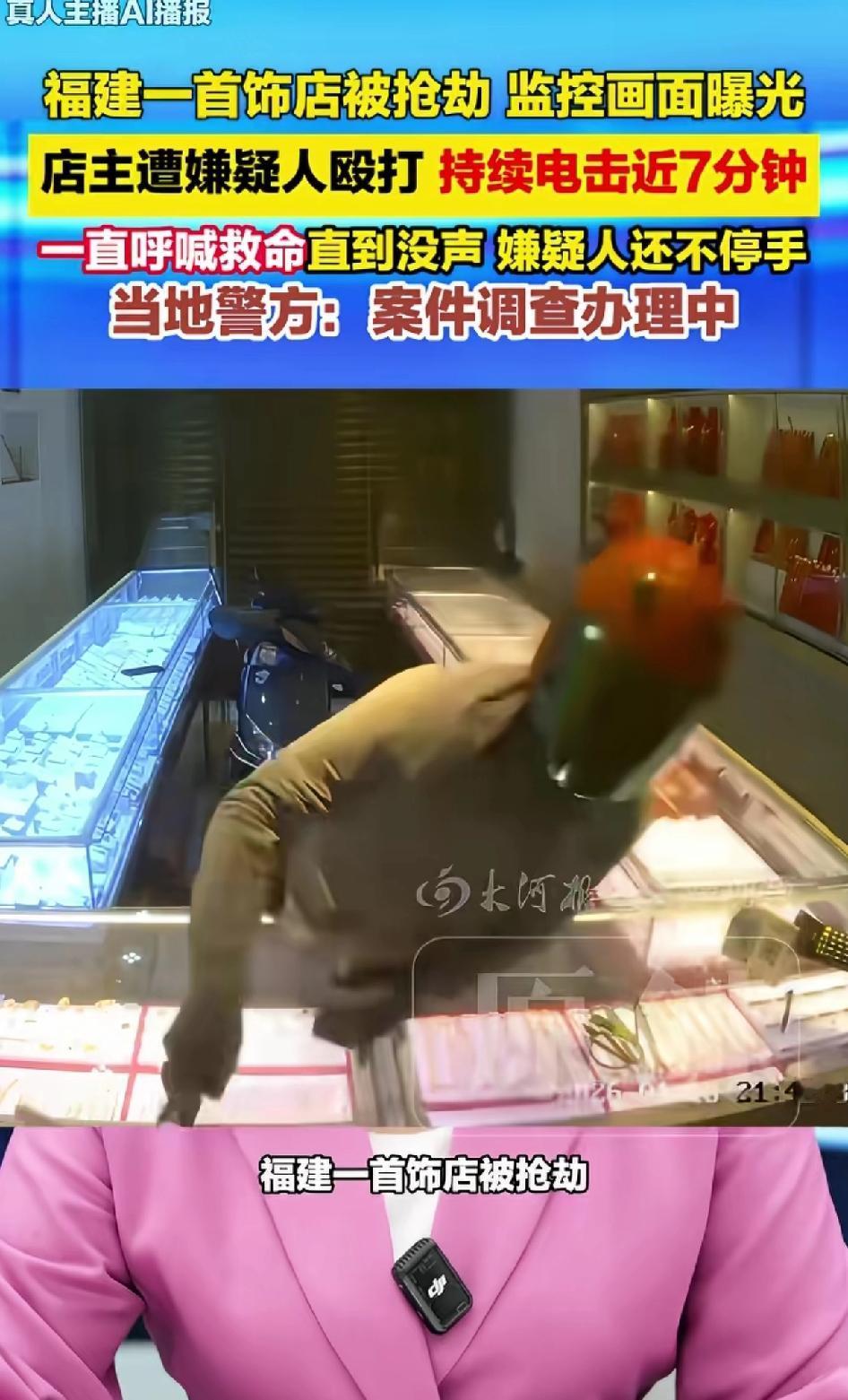 福建一首饰店被抢劫,监控画面曝光劫匪抢劫过程,画面里店主遭劫匪殴打和电击。 福建