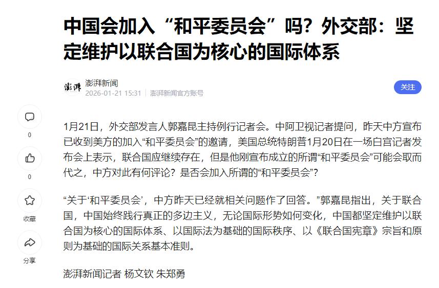 特朗普失算了!中国公开摊牌:坚定维护以联合国为核心的国际体系。1月20日,特朗普公然在社交平台发声:提到了他所创办的和平委员会,称联合国可以继续存在,但是他所成立的和平委员会,将有可能替代联合国。 事实上,不是中国不愿谈和平,而是美国这套玩法,从里到外都透着不对劲。 先说中国的底线。自乌克兰危机以来,中国连发《关于政治解决乌克兰危机的中国立场》文件,明明白白写着"冲突没有赢家",主张停火、和谈、重建三步走。 去年给乌克兰运了12批人道主义物资,连联合国都公开点赞。但美国呢? 一边造谣中国"军援俄罗斯",一边在瑞士搞的所谓"和平峰会",参会名单里没俄罗斯,议程全是"谴责俄方",这哪是劝和?分明是拉群批斗会。 中国要是去了,前脚进门后脚就得被泼脏水——2024年那场峰会就是先例,西方代表当场甩"中国军援"假证据,这种局谁爱淌谁淌。 再说特朗普的"和平委员会",到底是啥。 根据美方自己公布的章程,交10亿美元才能拿永久席位,7人执行委员会里6个是美国人,特朗普自己攥着"一票否决权"。 上海政法学院的专家算过账:说是国际组织,实则是"特朗普董事会"。 比如加沙问题,委员会要派"国际稳定部队",但调度权在以色列手里,这等于让别国士兵替美国火中取栗。 去年匈牙利总理欧尔班答应加入,结果国内抗议三天——谁愿意花纳税人的钱,给美国的地缘游戏当炮灰? 更关键的是,这套玩法直接拆联合国的台。联合国成立81年,193个会员国,虽说有毛病,但好歹是各国商量事的场子。 特朗普倒好,搞"会费换席位"的买卖,把国际事务变成公司董事会。 就像2025年那份泄露的草案,成员国任期三年,交钱多的永远留任,这和"谁出钱多谁说了算"的殖民逻辑有啥区别? 巴勒斯坦专家说得实在:"联合国解决不了的问题,美国委员会更解决不了——因为它根本不想解决,只想管人。" 中国不加入,还有笔现实账。2023年统计,联合国框架下的维和行动,中国贡献了16%的会费,派出2500多名维和人员,是安理会常任理事国里最多的。 反观和平委员会,光加沙一地的"监督"预算就高达50亿美元,全靠会员国摊派。 想想看,中国去年给联合国人道主义事务协调厅捐了1.2亿美元,救活了也门200万儿童,要是把这钱扔给特朗普的委员会,说不定连个响都听不到。 参考2024年美方主导的"中东重建基金",80%的钱最后进了美国承包商的腰包。 还有个绕不开的死结:美国总想着"另起炉灶",但国际问题哪是换个牌子就能解决的? 就说巴以冲突,联合国开了27次紧急会议,通过54份决议,以色列至少违反了32次。 特朗普的委员会说要"落实20点计划",可计划里连"两国方案"都不提,通篇都是"以色列安全优先"。 这种脱离联合国框架的操作,连埃及、卡塔尔这些斡旋方都摇头——去年12月加沙停火,就是联合国牵头谈的,美国委员会成立后,加沙人道物资入境量反而下降了30%。 中国拒绝的态度,其实早有先例。2019年特朗普提议美中俄三边军控谈判,中方直接怼回去:"美国核武库是中国20倍,凭什么拉我们谈?" 现在这套和平委员会的路数一模一样:嘴上喊"多边",实则是美国挑几个听话的国家,绕过联合国搞"小圈子"。 就像外交部说的,和谈得满足三个条件——俄乌都认可、各国平等坐桌、方案公平讨论。 看看和平委员会的成员名单,俄罗斯被排除,巴勒斯坦只有"技术官僚"列席,连发言席都没有,这叫哪门子和平? 说到底,中国不是反对和平,而是反对用"和平"当幌子的霸权。 联合国再不完美,也是193个国家一票一票投出来的规则;特朗普的委员会再好闻,也是拿10亿美元门票、7个美国人说了算的生意。 2026年1月21日,外交部发言人郭嘉昆说得清楚:"中国只认以联合国为核心的国际体系。"这话直白,但理就这么糙。 国际事务要是能用钱买、靠人多欺负人少,那还要国际法干什么?还要78年前各国代表在旧金山签的《联合国宪章》干什么? 现在回头看,特朗普失算就失算在低估了中国的底线。他以为搞个"商业委员会"模式,用钱和权就能拉拢国家,却忘了中国不吃这一套。 从乌克兰到加沙,中国始终站在"劝和不挑事、做事不站队"的位置上。 去年在联合国人权理事会,中国连提7项促和决议,场场高票通过,这才是大国该有的样子。 不是谁嗓门大、钱包鼓就听谁的,而是实实在在让冲突地区的老百姓,看到停火的希望、重建的可能。