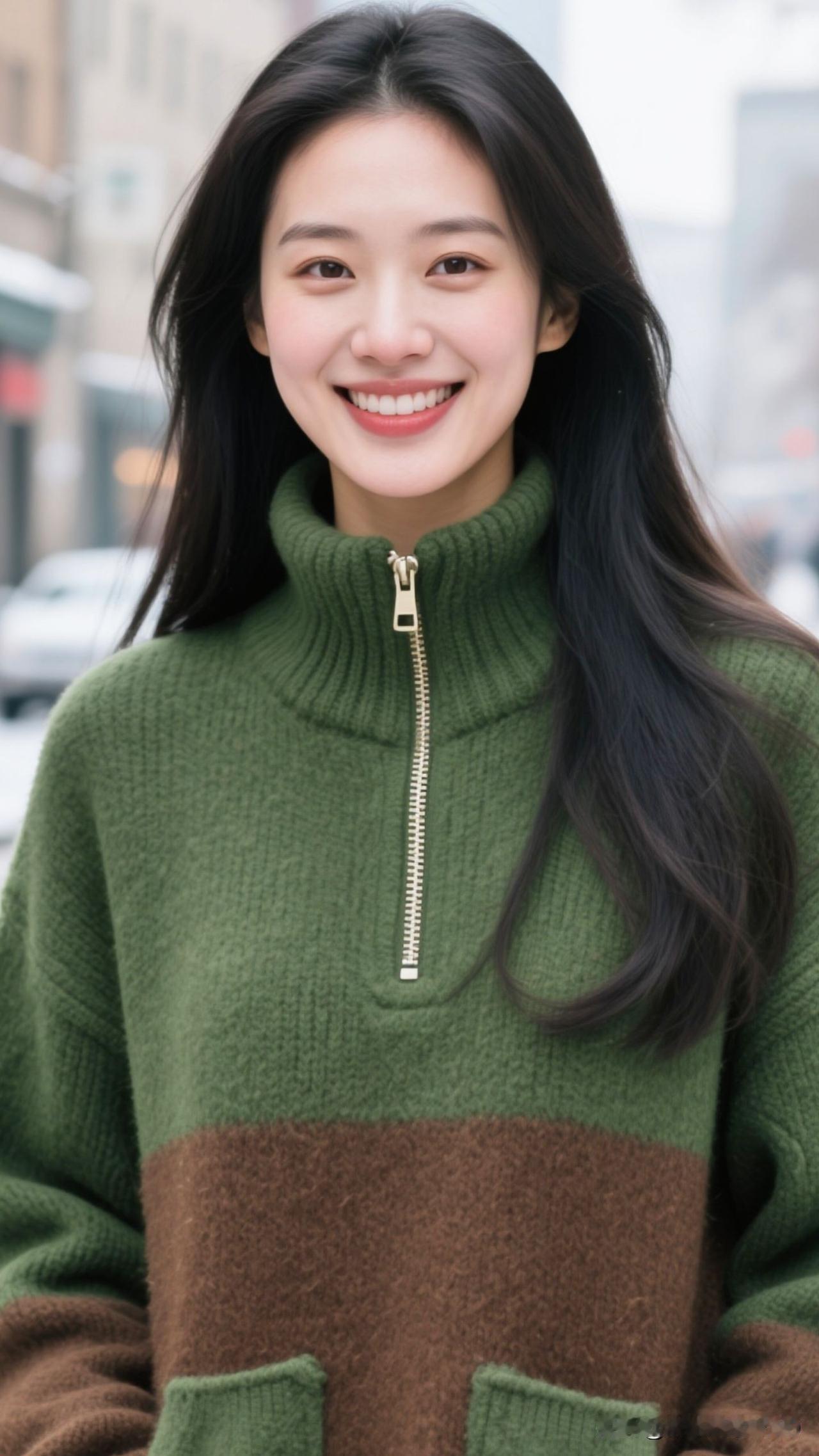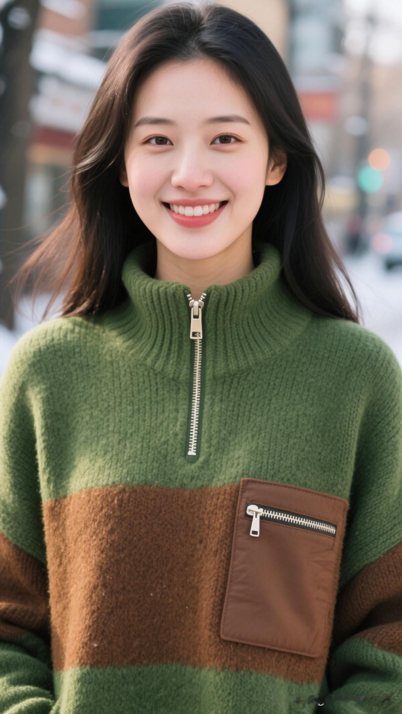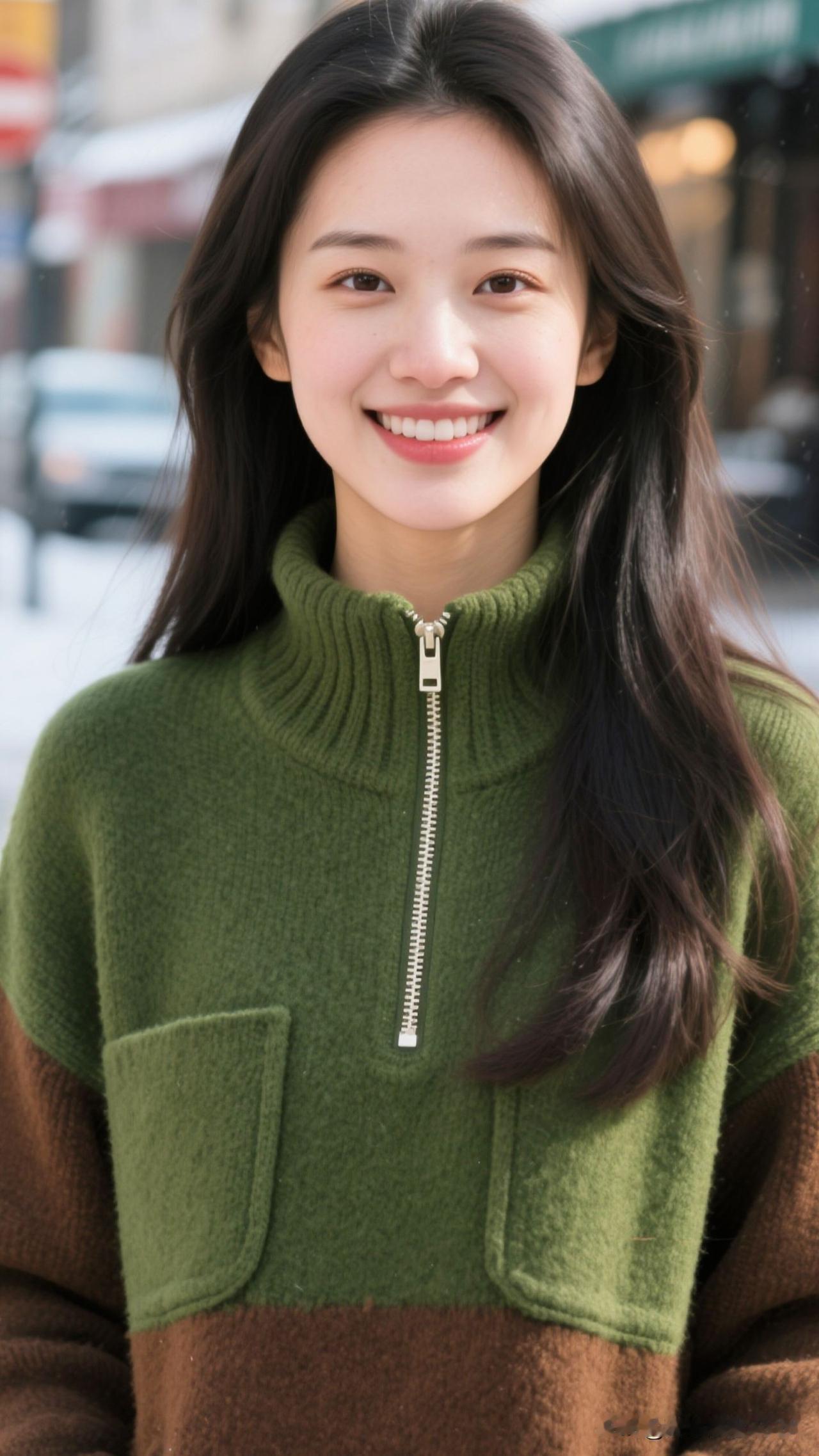 ❄️ 雪街为幕,绿棕毛衣织进冬阳的暖,拉链轻曳,连呼吸都浸着妥帖的温柔。