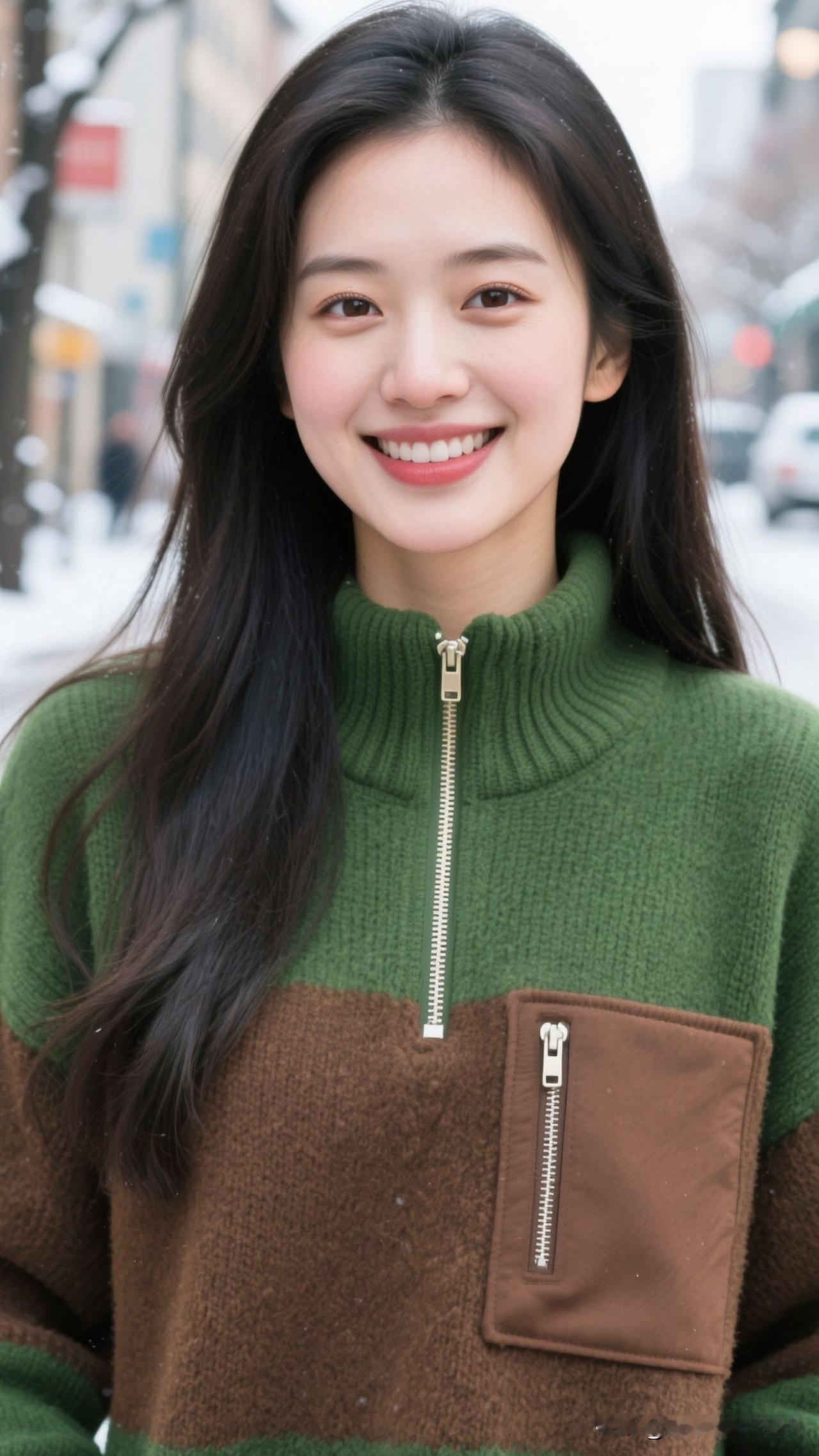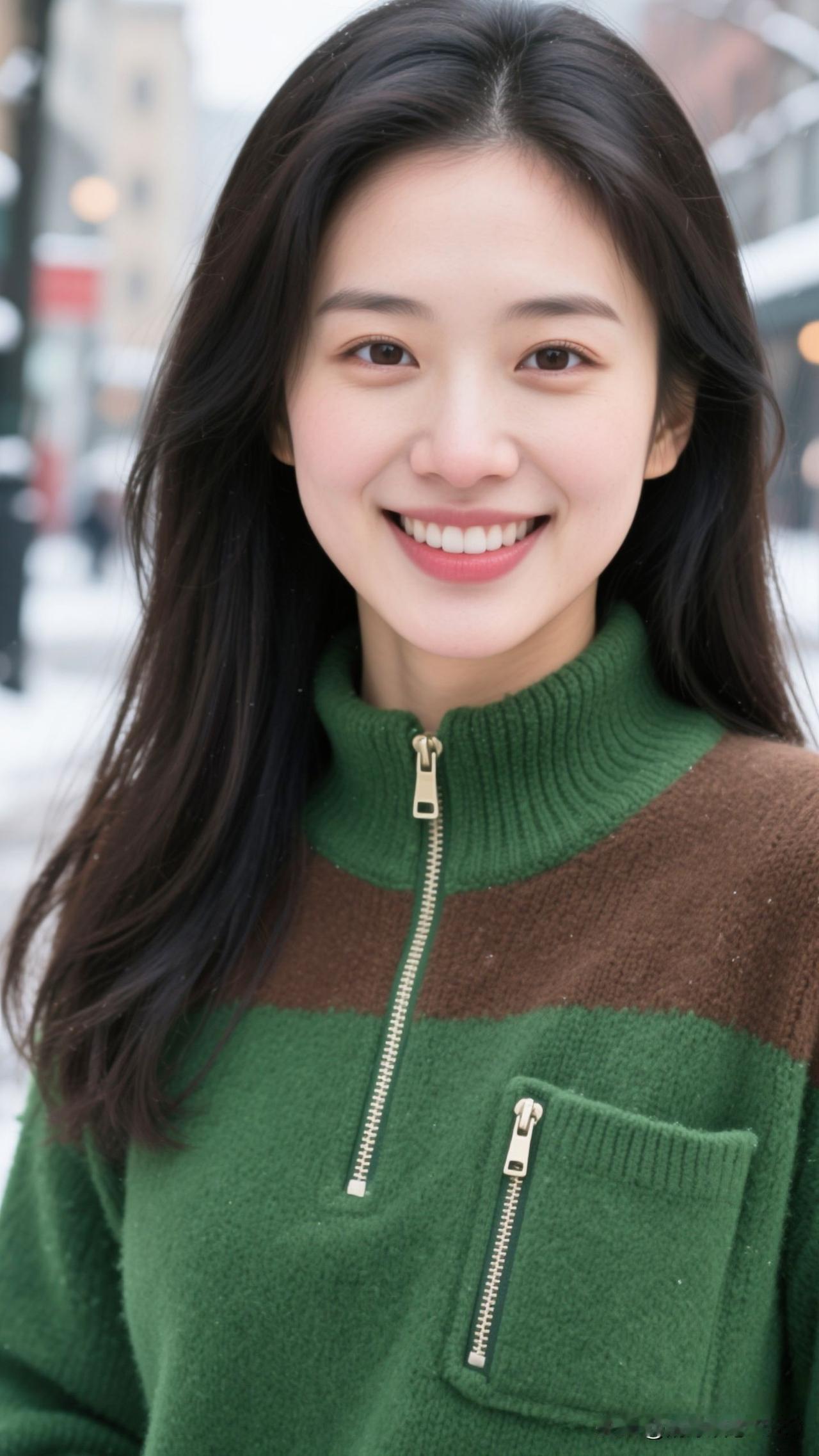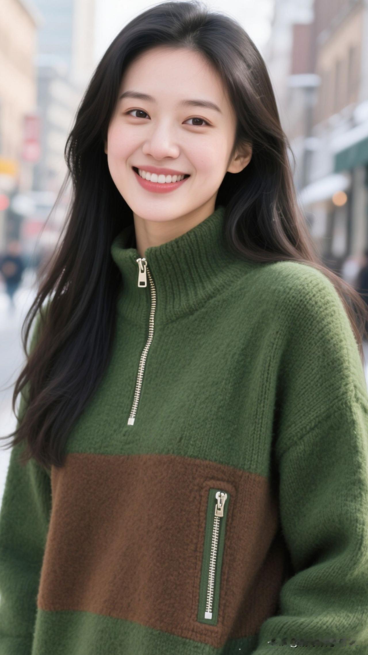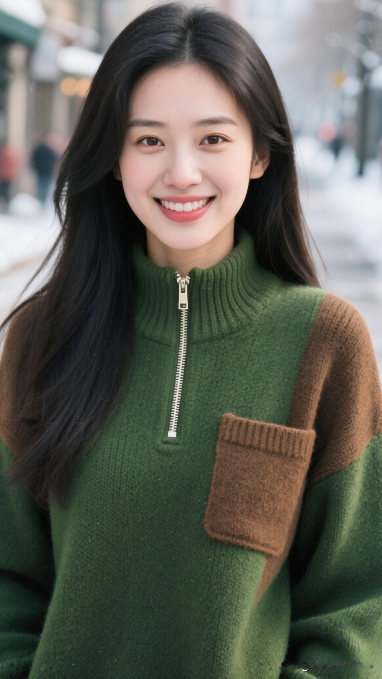 ❄️ 雪街为幕,绿棕毛衣织进冬阳的暖,拉链轻曳,连呼吸都浸着妥帖的温柔。