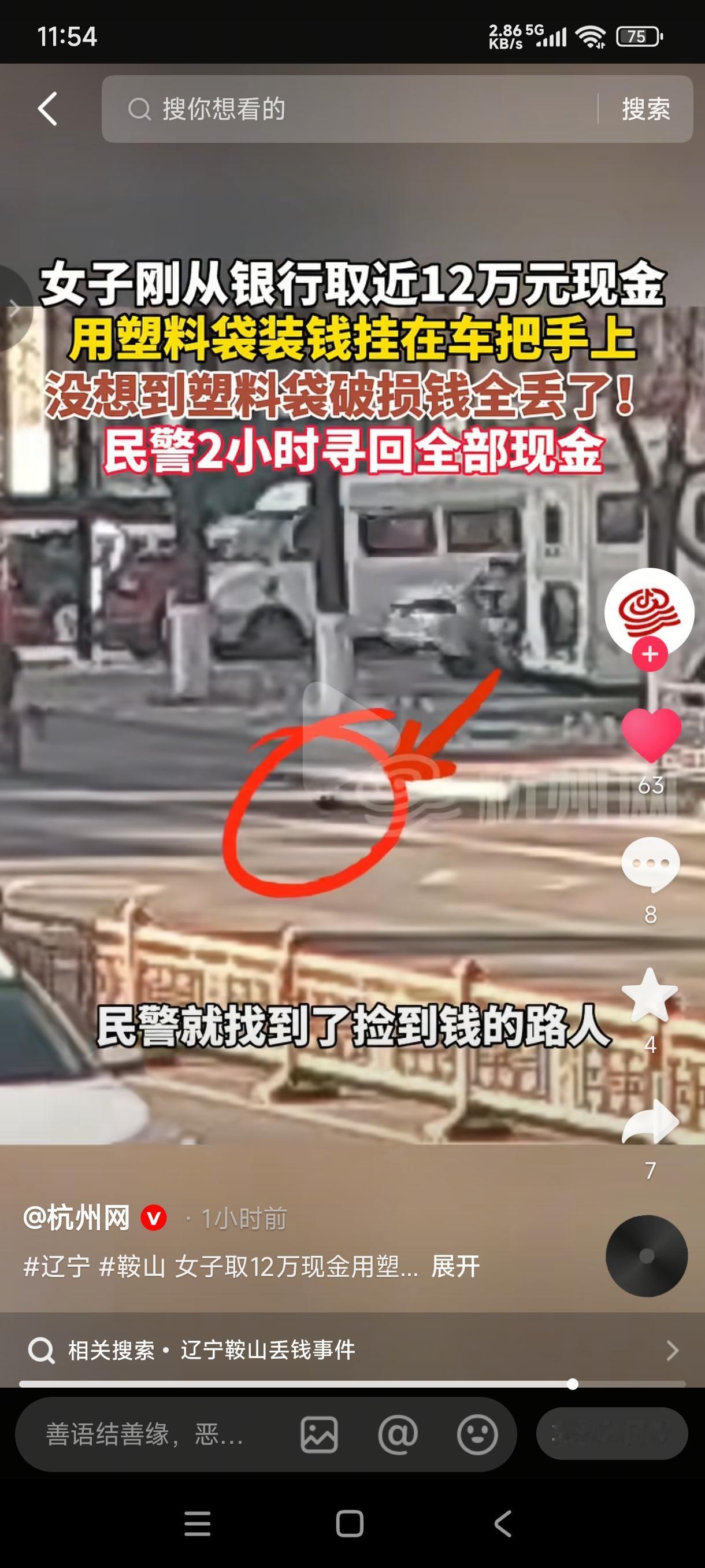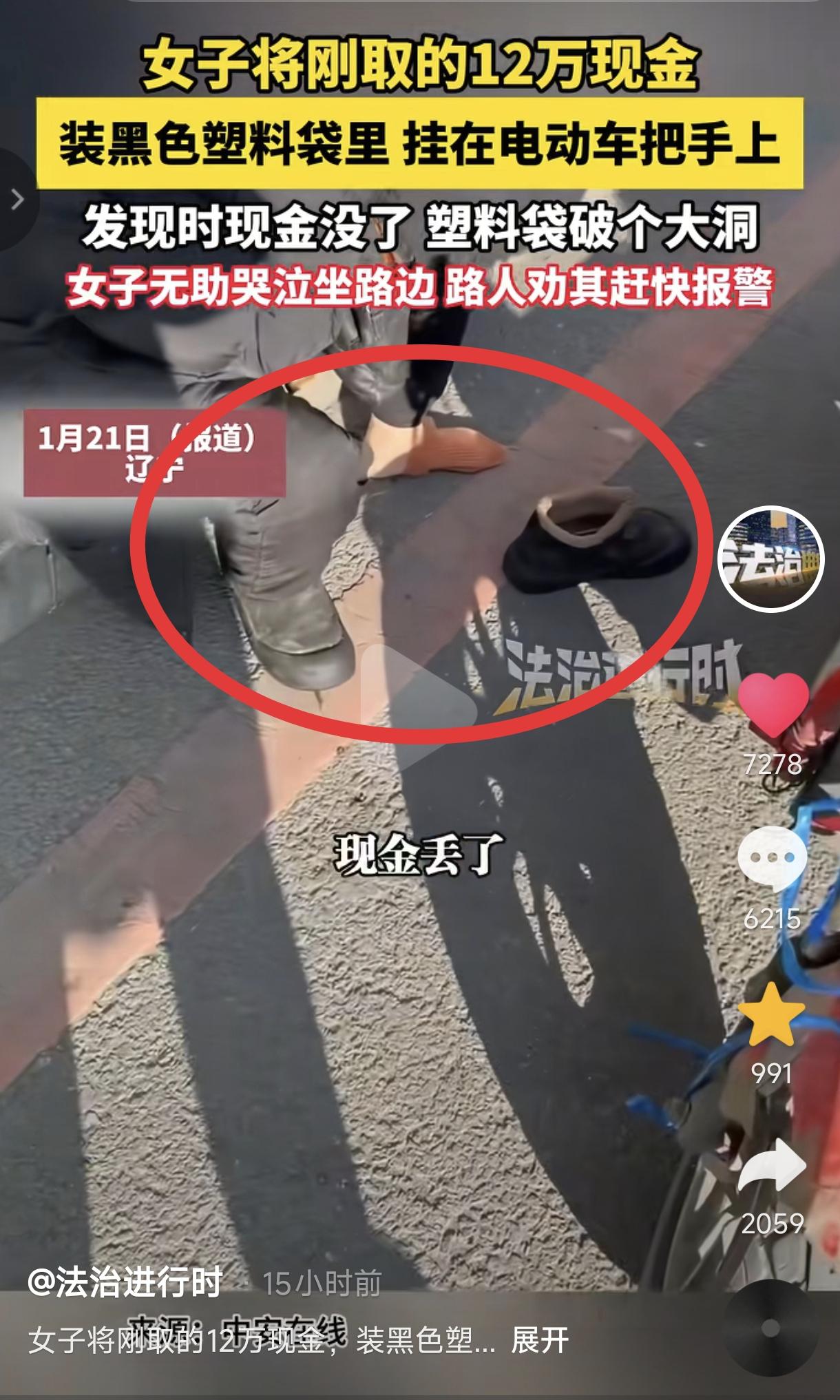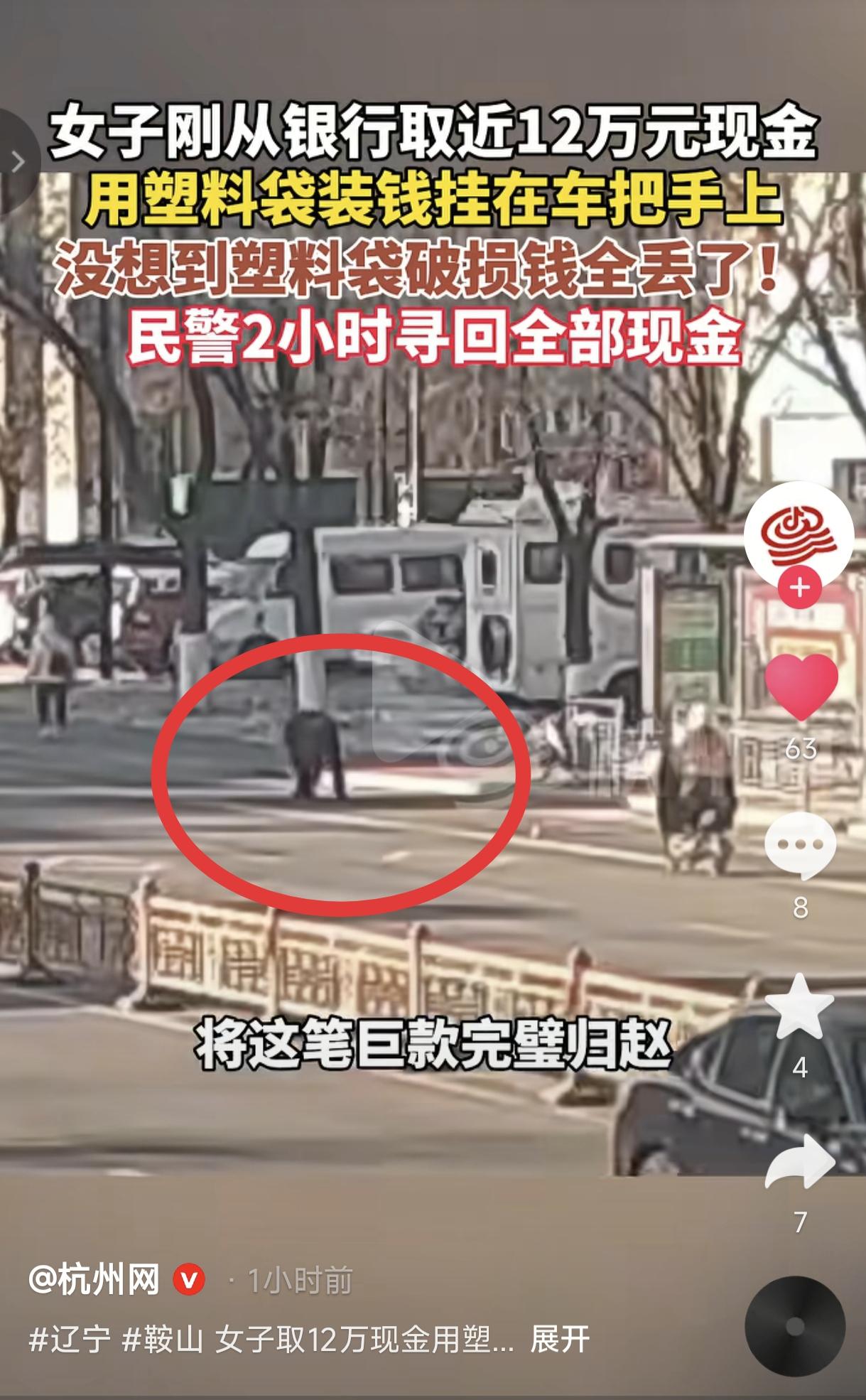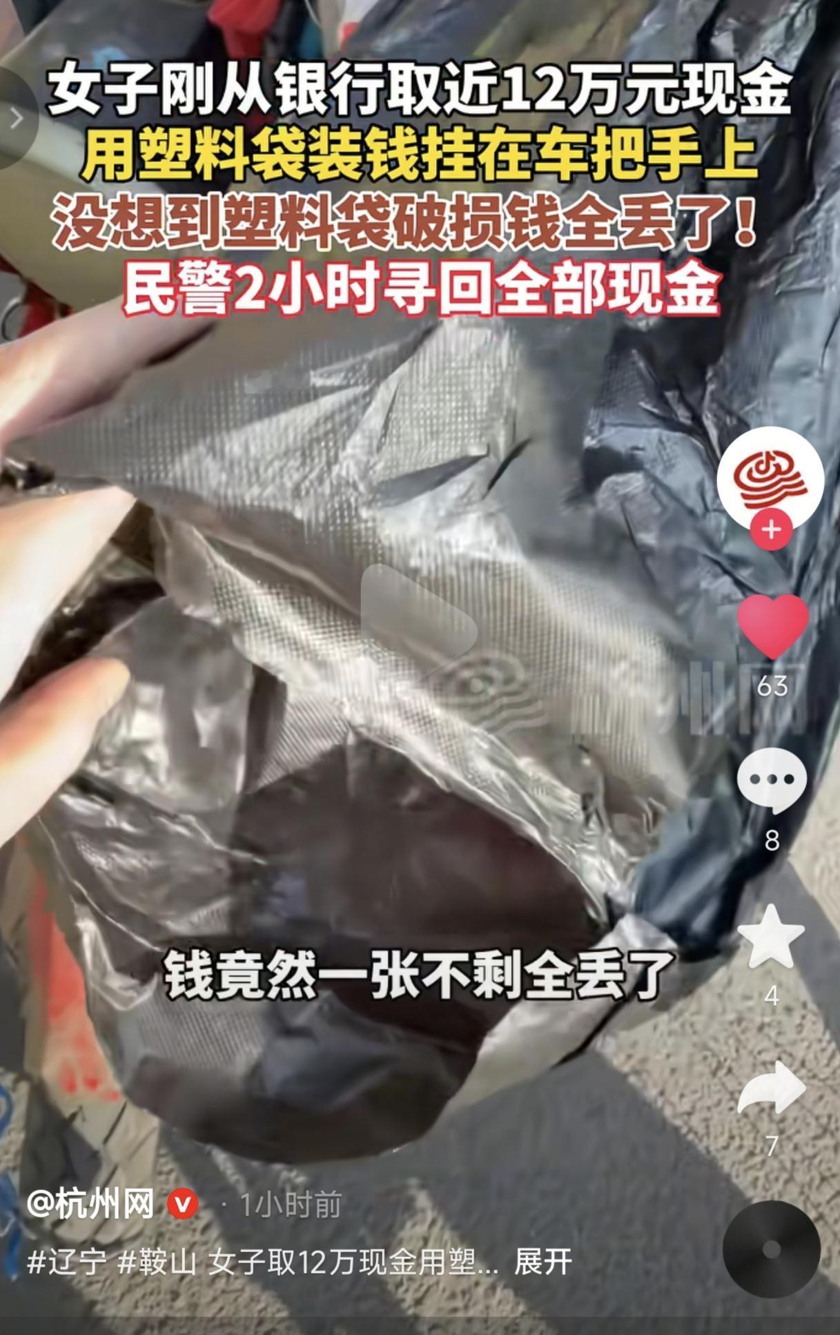 “心真大!” 辽宁鞍山,大妈为给儿子买婚房从银行取了11.6万元现金,随手用黑色塑料袋装着挂在了电动车把上,谁知刚走没多远被车撞了一下,这才发现塑料袋破了一个大洞,里面的钱全部丢光光了!急得大妈瘫坐在地上崩溃大哭,连鞋子都顾不得穿上,周围的热心群众于心不忍劝女子别哭了赶紧报警吧,最终民警经过沿街找寻及调取监控,仅仅2小时就找到捡到钱的路人将钱款全部找回。网友:看得人既揪心又温暖,为民警同志点赞! (来源:今视频长天新闻) 1月21日,辽宁鞍山,一位大妈为给儿子购买婚房,一大早就骑着电动车去银行取了11.6万元现金,没想到却发生了意想不到的事故。 大妈美滋滋从银行窗口取到了钱后,随手用黑色塑料袋装着出了银行大门,之后又随手将钱袋子挂在电动车车把上,骑车离开了。 按说这一切都十分顺利...... 没想到,大妈刚骑没多远,就在银行附近的一个路口被一辆出租车给撞了,人还被撞下了电动车,所幸人没事,大妈乐观地拍拍身上的尘土打算再行骑车离开。 可当她望向自己的黑色钱袋子时,顿时就吓得惊慌失措,只见那只黑色塑料袋已经完全破了正在寒风中随风飘扬着,里面的钱竟然不翼而飞,全部丢光光了,一张不剩! 大妈慌忙拿过钱袋子一看,只见袋子底部已经全部破损了,出现了一大条整整齐齐的大口子,这哪里还兜得住钱呢。 到底是装钱时塑料袋就是破的,还是被车撞时袋子才破的,大妈脑子里一片空白,毫无头绪,她尝试着在电动车周围寻找钱款,但是找了一大圈都没见着一点钱影儿。 突如其来的丢掉一大笔巨款,大妈顿时急得瘫坐在冰冷的水泥路上崩溃大哭,之后她实在没法就给家人打去了电话,大哭着说:“钱丢了,真的丢了......”然后泣不成声。 这可是零下几十度的大清晨啊,大妈眼睛都哭肿了,被撞掉了的一只鞋也顾不得穿上,一只袜子还半拉着,就那么踩在地面上,看着真是太可怜了。 而大妈之所以哭得这么撕心裂肺,也是因为这一笔钱是大妈辛辛苦苦攒了整整三年多的血汗钱,想着儿子要结婚了就取出来帮儿子买婚房用的。 周围的热心群众见状,于心不忍,都纷纷跑过来安慰大妈,又暖心地给她出主意:“你哭也没用,急也没有用啊,还是赶紧报警吧”。 报警之后,民警便陪着大妈沿街找寻,又快速调取监控查看,仅仅2个小时就找到捡到钱的路人,路人也将钱款全部归还了回来,总计116735元。钱款失而复得,大妈激动不已,向民警连连称谢。 网友们看到这一幕,也是忍不住热议起来。有网友说,用塑料袋装钱,大妈还真是心大,我兜里装一万块钱都要摸很多遍,生怕丢了。 也有网友说,我去银行存一万块,还放在包的最里层,我还左看右看生怕有人给我抢了,还把包抱得紧紧的。 也有网友说,我第一次去银行取了30万没拿袋子就拿着往外走,大厅经理赶紧拉住我,给我找了个袋子装上。 还有网友说,银行按说应应该给个袋子给大妈装钱啊,大妈也奇葩塑料袋能装住钱么?我装10万都要套几层袋子。 还有网友说,大妈还是心大了,12万元都不当回事,顺手将塑料袋挂车把上,太粗心大意了,还好民警同志太给力全部找了回来,为民警同志点赞! 不得不说,女子用塑料袋装12万现金又将之随手挂车把太有安全隐患了,因为塑料袋被剐蹭后极易破损导致钱款遗失,还可能会成为不法分子的目标。 当然从法律层面看,路人若捡到女子散落的钱款也有主动归还或上交警方的义务,若占为己有且数额较大还可能涉嫌侵占罪,因此面对此类情况最好的做法是报警。 还有警方办案太高效了,不仅及时响应还在仅仅2小时就悉数找回钱款,当然也离不开监控及热心群众的配合,同时说明朗朗乾坤之下任何行为终将暴露于阳光之下。 此案例也给大家提了一个醒:大额现金一定要妥善保管与随身携带,多留一个心眼,若取用,最好通过转账方式进行,以免被不法分子盯上。