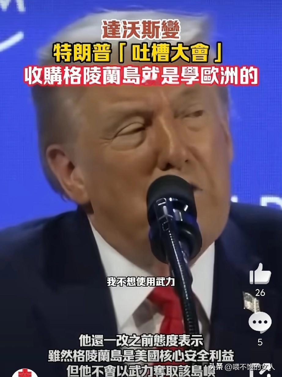 疑惑!是谁让特朗普去参加达沃斯论坛的?不让他去不就好了吗?把他晾到一边。你看看他去了欧洲人有好果子吃吗?一口一个格陵兰岛,一口一个格陵兰岛,再说一段时间,这洗脑就成功了。