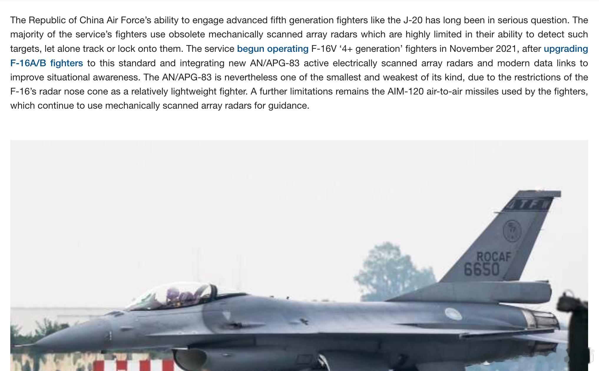 之前解放军“正义使命2025”演习我军公布了 J-20 飞抵台岛上空的影片,美国媒体《军事观察》给予更明确的说法,画面所示是在台湾岛屏东空军基地附近飞行,按理说,它应该会被拦截。“按理说”这个说得很好,道理里面首先你得先看得见,得先晓得,也昭显现在已经无需理会他们所谓的“道理”了,这些地方都是领土一部分,至于为啥他们没反应,懂的都懂 ..... 然后文章继续数落了台空军的装备一番,指出哪怕升级到 AN/APG-83有源相控阵雷达,但它仍然是同类雷达中尺寸最小、性能最弱的。此外,F-16V 使用的 AIM-120 空空导弹仍然使用机械扫描阵列雷达进行制导,毫无优势可言。但对完全没有任何预警发现的岸基防空雷达系统则一字不提。歼20歼20歼-20