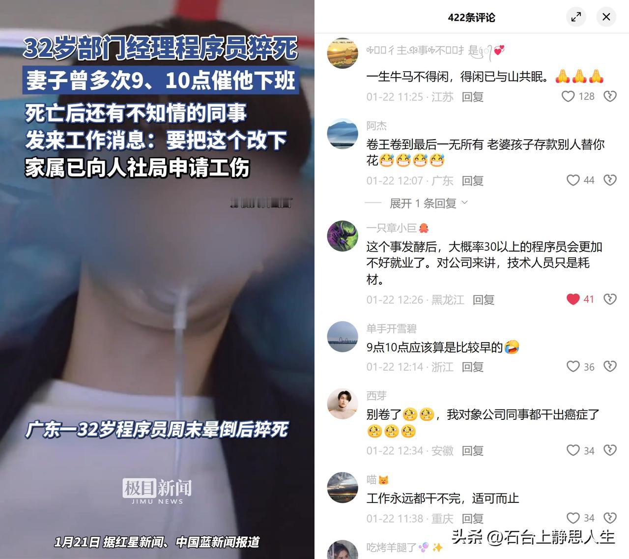 32岁程序员猝死,抢救时被拉工作群,死后还收到“改需求”消息,这事看完我后背直发凉。 广东这小伙子是部门经理,周末晕倒没救过来。生前天天加班,最早晚上9点半才到家。抢救的时候同事拉他进工作群,人没了8小时,还有人发消息让“要把这个改下”。家属已经申请工伤了。 咱们打工人怕的从来不是加班,是你把命搭进去了,人家还觉得你是个随时能替换的零件,抢救着呢先拉群,死了还记着让你改需求,这哪是同事啊?这是把人当永不关机的电脑呢! 有人说“一生牛马不得闲,得闲已与山共眠”,这话让人难受得想掉眼泪,我们天天卷,卷到凌晨的咖啡杯里泡着枸杞,卷到体检报告上的箭头比工资条还长,卷到最后连死都没逃出工作的绑定? 现在职场都在说“35岁危机”,可比35岁更怕的是,你把青春和健康都给了公司,公司把你当“一次性耗材”,用的时候往死里榨,没用了直接丢一边。你以为你在为未来奋斗,实则是在给公司攒棺材本? 到底是工作为了生活,还是生活为了工作?咱们加班是为了多赚点钱给孩子买玩具,给父母买保健品,不是为了让公司把你的命算成“运营成本”啊! 希望工伤能认定下来,也算给逝者一个交代。更想跟所有打工人说:别等身体垮了才明白,命是自己的,钱赚不完,咱得活着,才能陪家人吃顿热饭,才能看见孩子长大,才能对得起自己熬的那些夜、掉的那些头发。 愿逝者安息,也愿我们都能活成“人”,不是“耗材”。