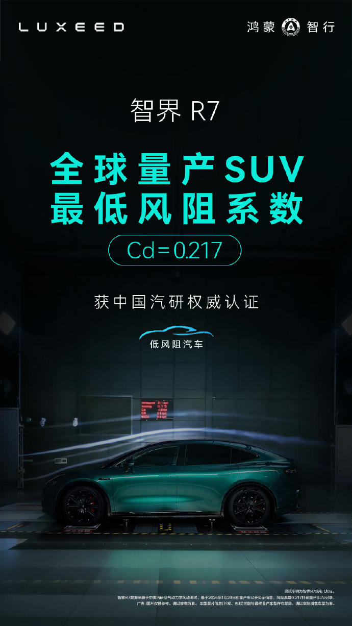 智界R7创全球量产SUV最低风阻纪录我所在城市产。骄傲!智界R7以0.217Cd创下全球SUV最低风阻纪录,意义重大。它巧妙平衡了超低风阻与SUV的实用性,用技术实实在在地降低了高速电耗、提升了续航与驾乘品质,是电动车领域一次值得肯定的技术落地。你的续航有多少为风阻买了单