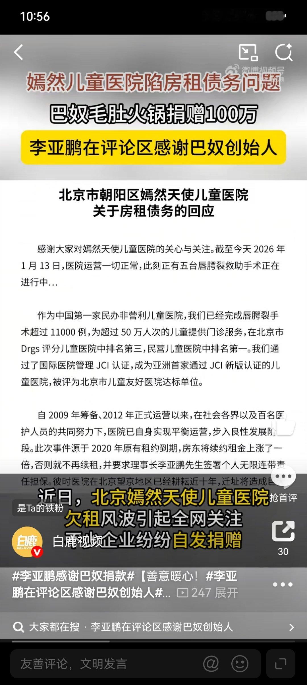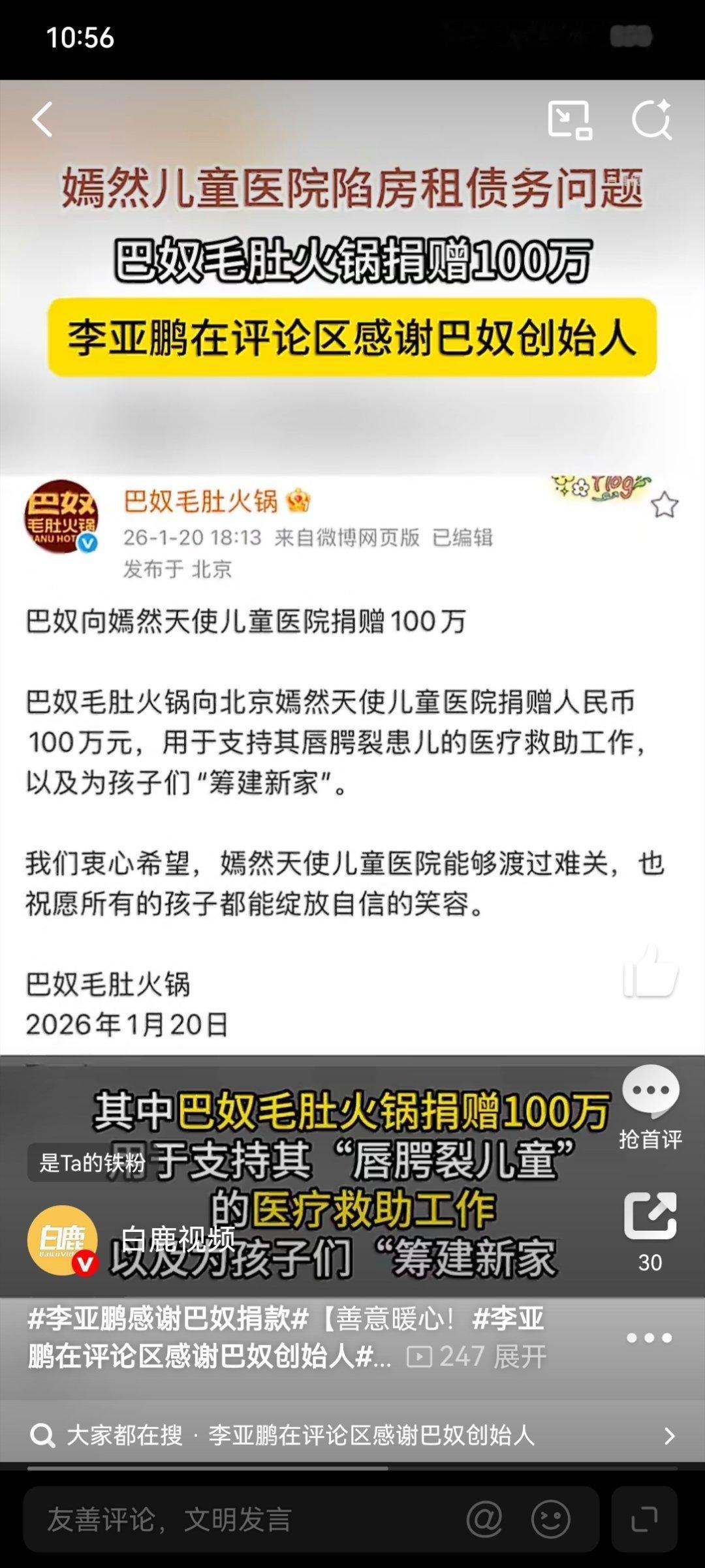 李亚鹏感谢巴奴捐款 企业公益捐赠值得肯定,李亚鹏的公开致谢体现了对善举的尊重。慈善事业需要更多社会力量参与,企业履行社会责任、公众人物积极回应,能形成正向激励。希望善款真正用于需要帮助的儿童,让善意落到实处。李亚鹏在评论区感谢巴奴创始人