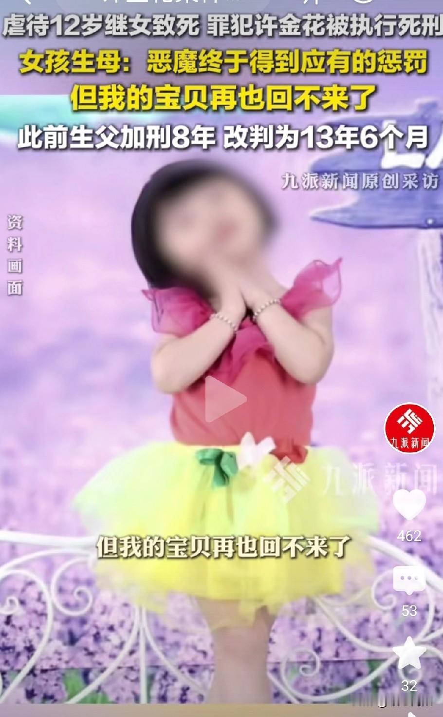许金花13岁时就在洗浴中心当坐台小姐,后来嫁给一个比她大20岁的老男人。 许金花是1983年出生,从小父母双亡,跟随亲戚过着寄人篱下的生活。13岁时就辍学了,为了生存,去洗浴中心当坐台小姐。 后来,认知一个老男人对她很好,也许是从小没得到父母的爱,这个大她20岁的男人出现她面前,就好像父亲一样关怀她爱她,找回了童年缺失的爱,让她感受到家的温暖。 她决定嫁给这个男人,婚后因为自己没有生育能力,便收养了两个孩子。慢慢地她发现这个男人有赌博的行为,于是两个人经常吵架,便选择了离婚,男人把房子让她居住,两个孩子由她抚养。 后来她在打工时,认识了刘江,刘江也是离异,二人便组建了家庭。一穷二白的刘江带着女儿琪琪住进了许金花的家。 和刘江结婚以后,许金花又收养了一个孩子,以前许金花收养了二个孩子,刘江带的一个孩子,总共四个孩子。 许金花到底是怎样的一个人?你说不爱孩子,她一个接一个地收养,你说她爱孩子,她且容不下刘江的孩子,真让人无法理解。 平时里刘江忙于饭店,孩子由许金花照顾,孩子多吵闹是难免的,可是许金花还指使其他孩子打琪琪。 2023年9月,琪琪升初中,许金花不让琪琪上学,叫在家做家务,由于琪琪年纪小,做不好家务,许金花非常生气,动不动就打琪琪。 2023年12月6日,她把琪琪捆住仍进了厕所,不给吃饭,不给喝水,还逼着叫喝泻药,又冻又饿,折磨了17天后(12月22日)不幸身亡! 最可恨的是刘江知道女儿被许金花虐待,也不阻止,也帮购买泻药,放任许金花的行为,许金花肆无忌惮地更加猖狂。 直至琪琪活活地被折磨死,夫妻两人且毫无悔意,法庭上刘江还替许金花求情,不应该判死刑! 最终经法院审理查明,许金花被判处死刑!刘江被判13年6个月。 2026年1月20日,许金花被莆田市中院依法执行死刑!许金花受到应有的惩罚!可是琪琪再也回不来了!