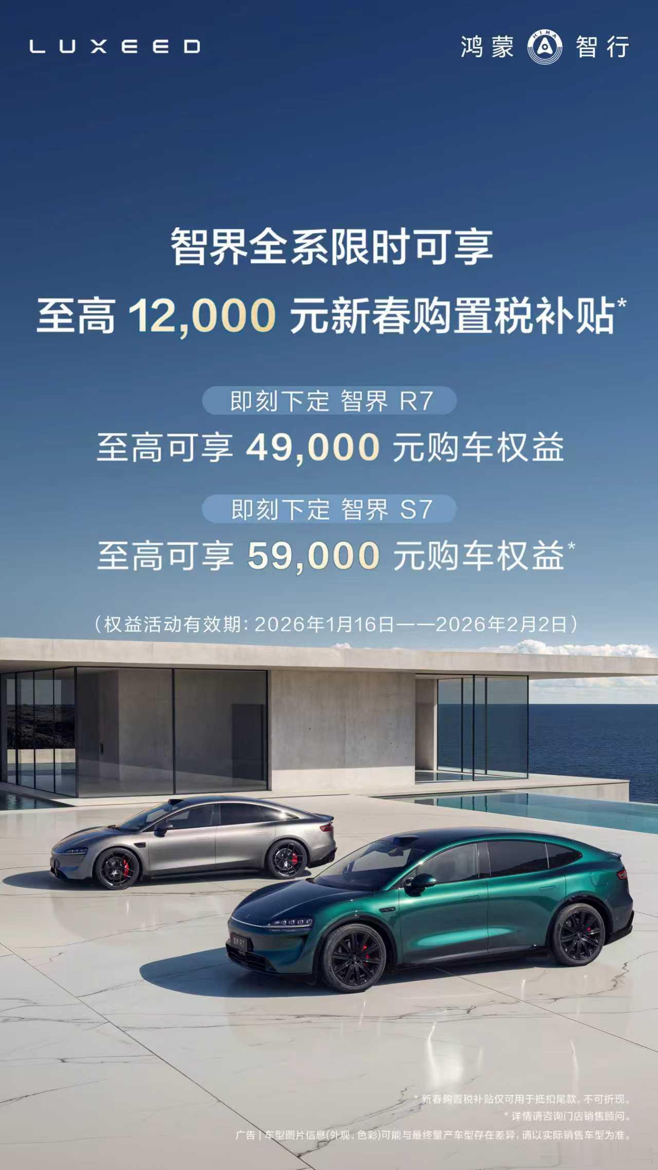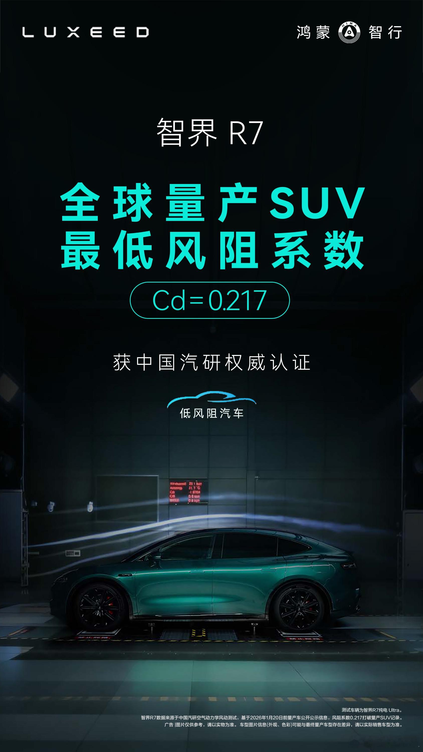 智界R7创全球量产SUV最低风阻纪录还得是智界啊!R7纯电Ultra版在中汽研专业风洞测试中,实测风阻系数低至0.217,一举创下全球量产SUV最低风阻纪录。这一突破得益于全维度气动工程优化,让车辆既保有SUV宽体大空间、高通过性的优势,又实现轿跑级低风阻,带来更低能耗、更小风噪的极致驾乘体验。在其硬核实力加持下,智界市场表现一路高歌,连续数月交付破万。临近新春,购车福利重磅加码!即日起至2月2日,全系享至高12000元新春购置税补贴,智界R7至高49000元购车权益,新S7至高59000元权益,入手正当时。你的续航有多少为风阻买了单