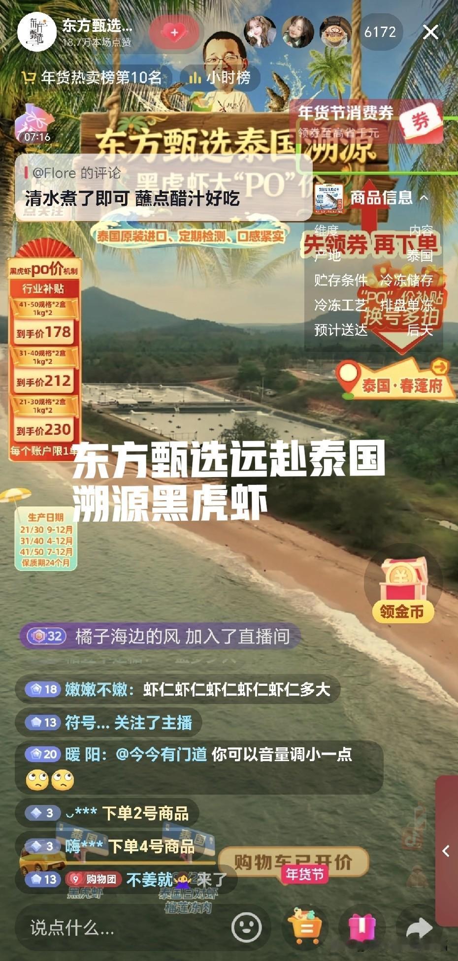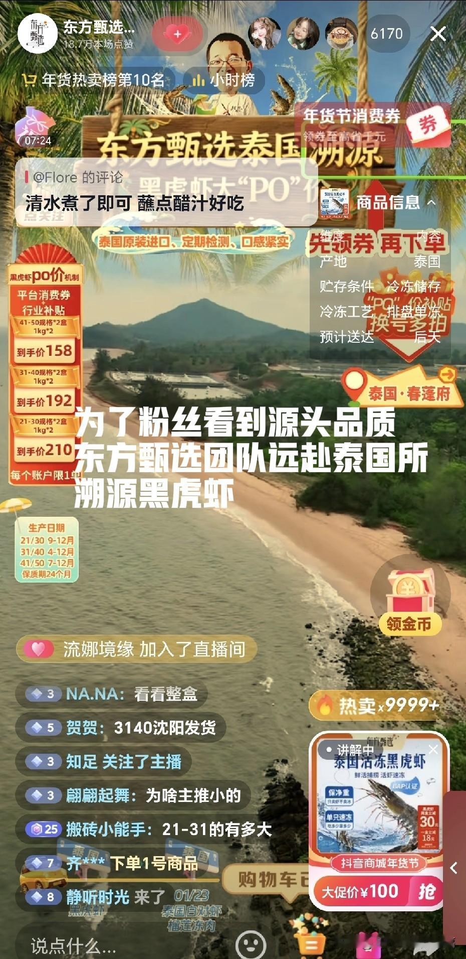 就为了让粉丝们看到源头的好品质,东方甄选竟然团队去泰国实地溯源了!就为了这股真诚劲儿,东方甄选的东西会让你失望吗?溯源不仅是让大家看到产地的实况,还能警示商家时刻保持产品品质。 东方甄选悄咪咪地干了件大事,主播冯冯去泰国溯源黑虎虾了,这一声招呼也不打就出国了?东方甄选的黑虎虾买过多次,比普通大虾肉质紧实,这次我咋会错过呢?下单了中号40—50支的,虽然个头不是最大,但是更实惠一些,家有健身人士,还有长身体的,备点大虾是必须的。 我家的鸡蛋,肉,小零食,披萨,小笼包,纸巾,湿厕纸,奶(纯的,酸的),四件套,甚至一次性的碗罩……除了服饰好像都在复购,我在考虑要不要加下粉丝团。我因为没有加入粉丝团,好像亏了不少啊[微笑]